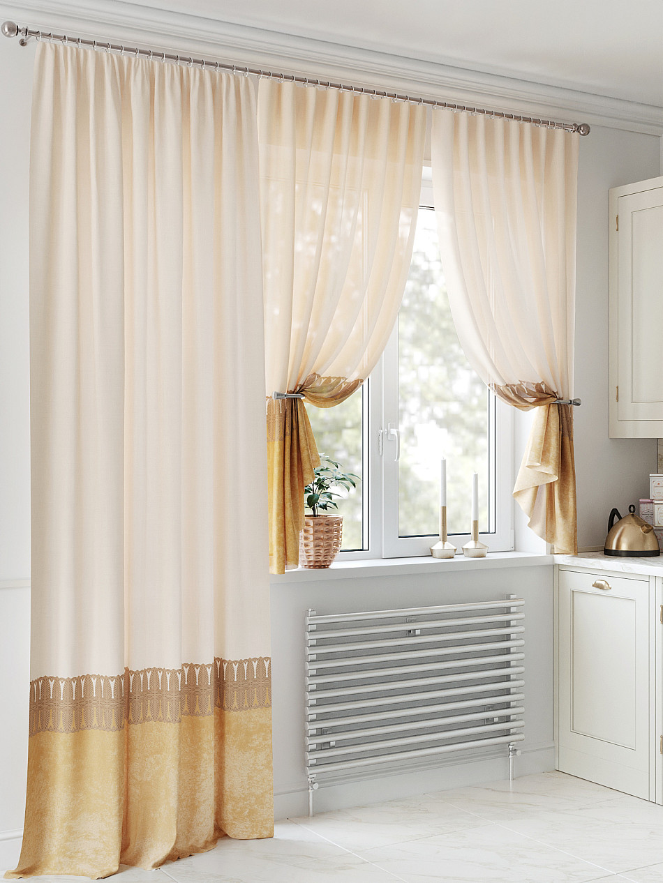 Портьера 150х270 см — 1 шт., вуаль 150х180 см — 2 шт. ( Уменьшить высоту ) Крепление: шторная лента (крючки), кулиска Подробнее