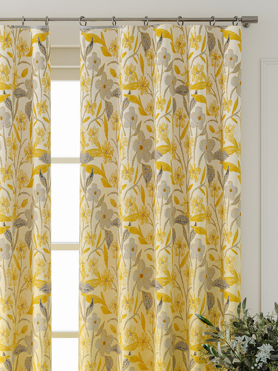 По верхнему краю портьер пришита шторная тесьма 6 см, с ее помощью затянув узелки от кордовых нитей с обеих сторон и стянув их до нужного размера можно сформировать округлые складки, далее вставить крючки в кармашки и повесить на карниз. Обязательно проверьте кордовые нити – они должны быть надежно завязаны, в противном случае во время стягивания они могут вылететь. Шторная тесьма имеет два ряда кармашков, с их помощью можно регулировать не только длину, но и ширину. Такое крепление подходит для всех типов карнизов.
