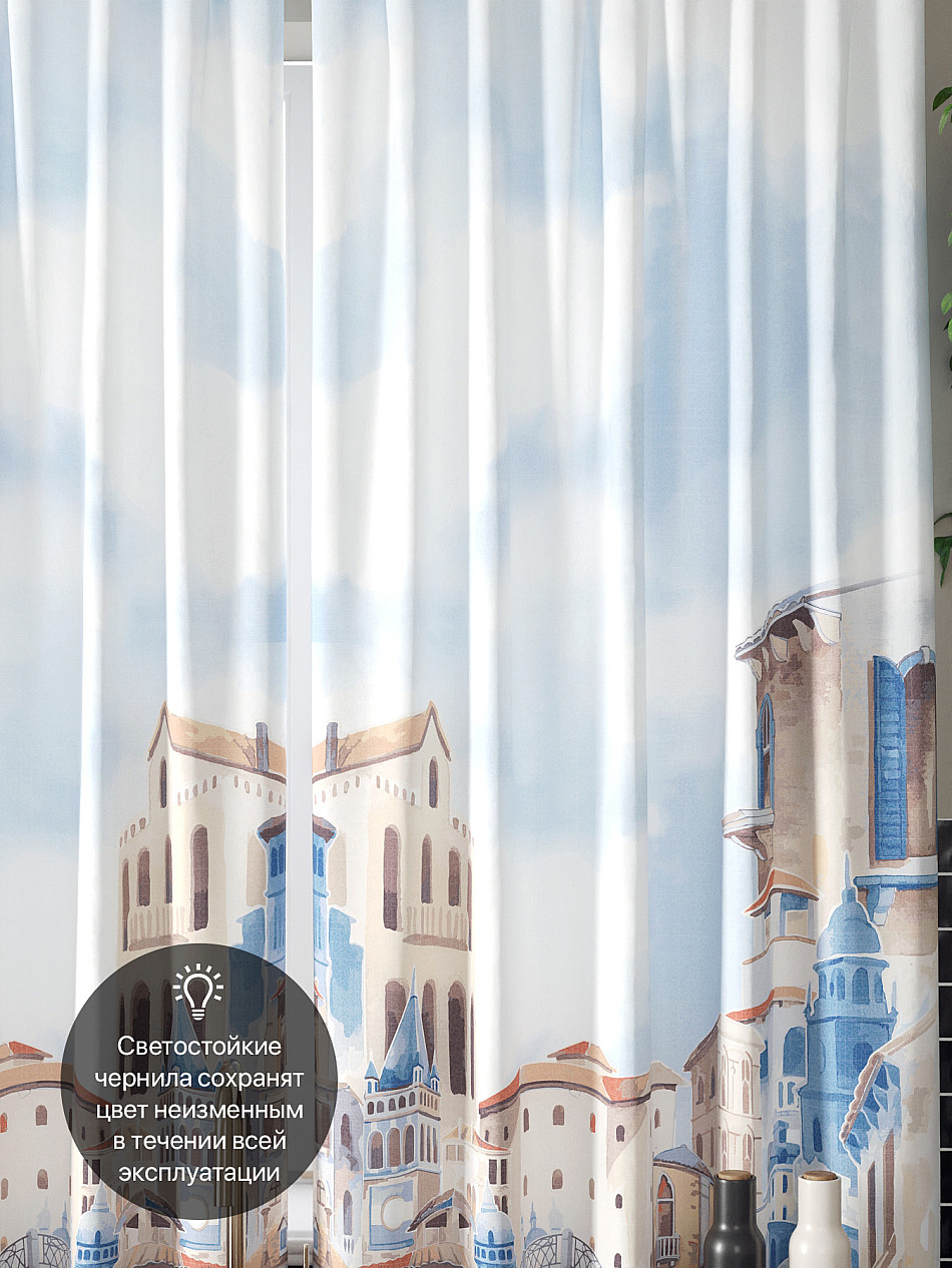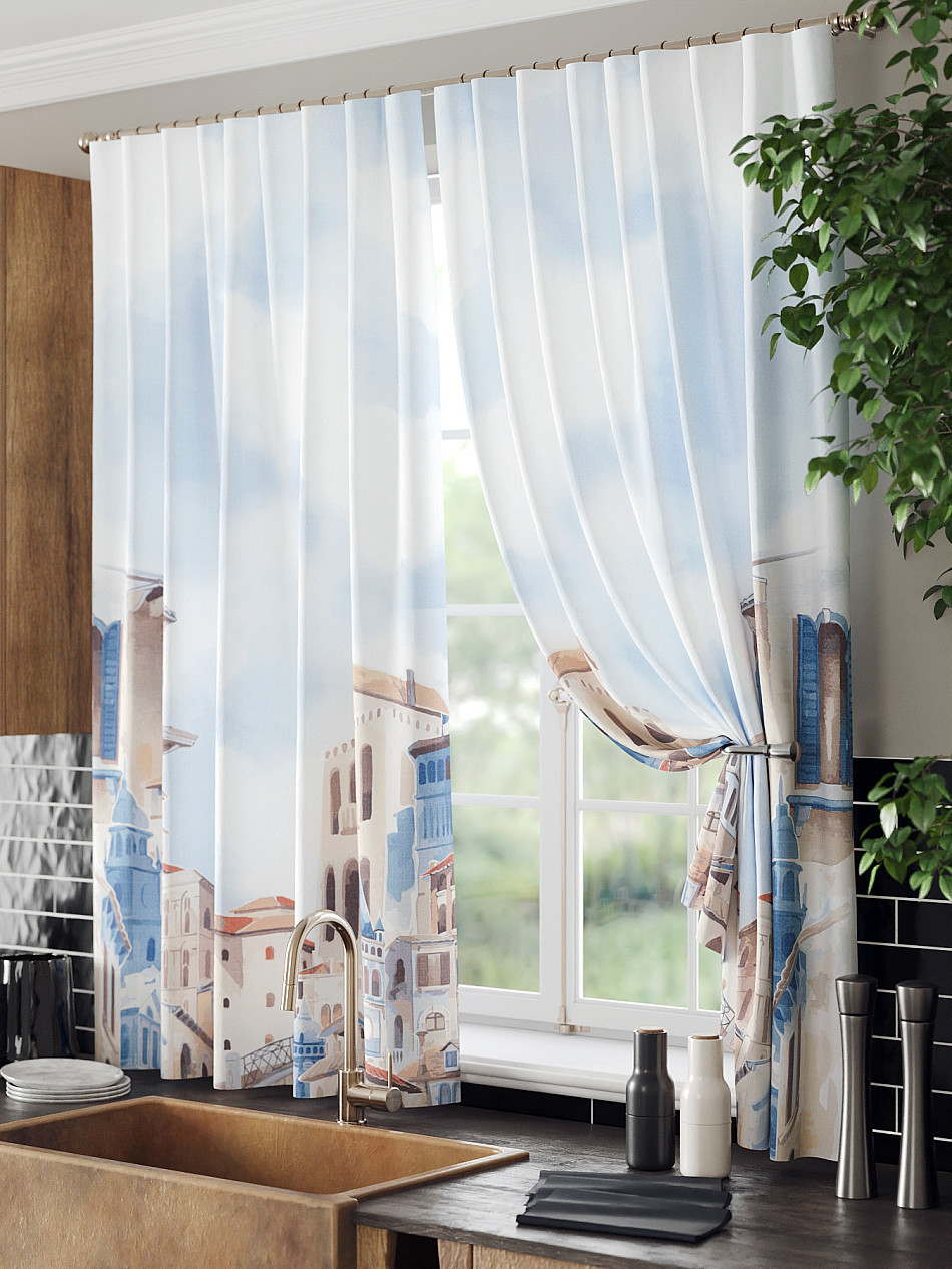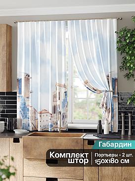 Комплект штор из легкой портьерной ткани (габардин) оформлен печатным рисунком. Печатный рисунок дает широкие возможности обновить интерьер фактически нет требуя ремонта за счет огромного выбора. Ткани с печатным рисунком безопасны и не содержат токсичных веществ. Не смотря на то что, материал легкий, он имеет высокую плотность, мало загрязнятся и не требует особого ухода даже после стирки, что важно для кухонных занавесок. Шторы не выцветают, не растягиваются, превосходно драпируются, образуя струящиеся складки. Прекрасное решение для создания красоты и уюта с помощью уникальных дизайнов.