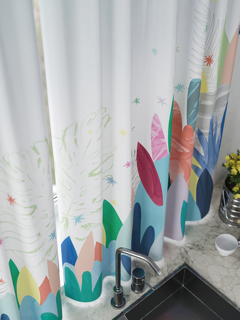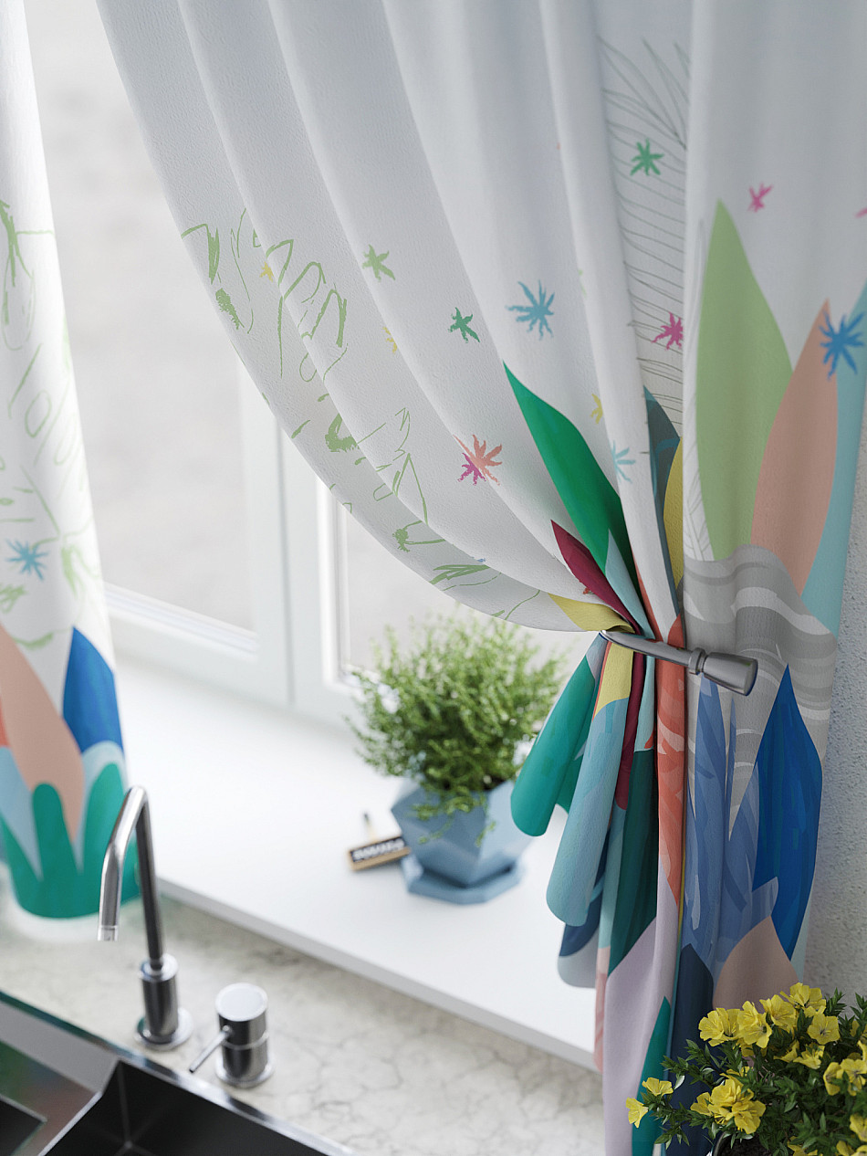 Портьеры 2 шт: Комплект штор из легкой портьерной ткани (габардин) оформлен печатным рисунком. Печатный рисунок дает широкие возможности обновить интерьер фактически нет требуя ремонта за счет огромного выбора. Ткани с печатным рисунком безопасны и не содержат токсичных веществ. Не смотря на то что, материал легкий, он имеет высокую плотность, мало загрязнятся и не требует особого ухода даже после стирки, что важно для кухонных занавесок. Шторы не выцветают, не растягиваются, превосходно драпируются, образуя струящиеся складки. Прекрасное решение для создания красоты и уюта с помощью уникальных дизайнов.