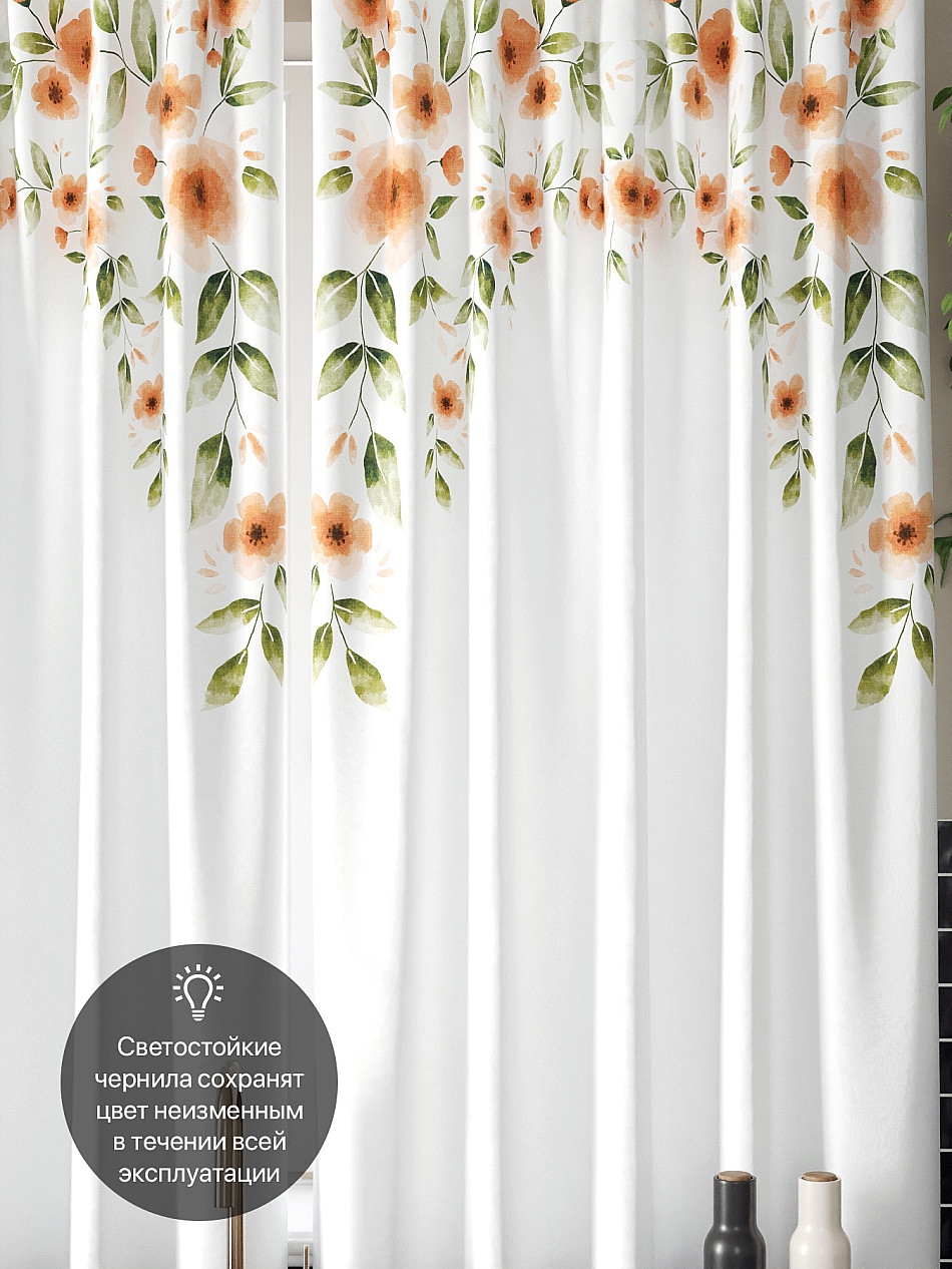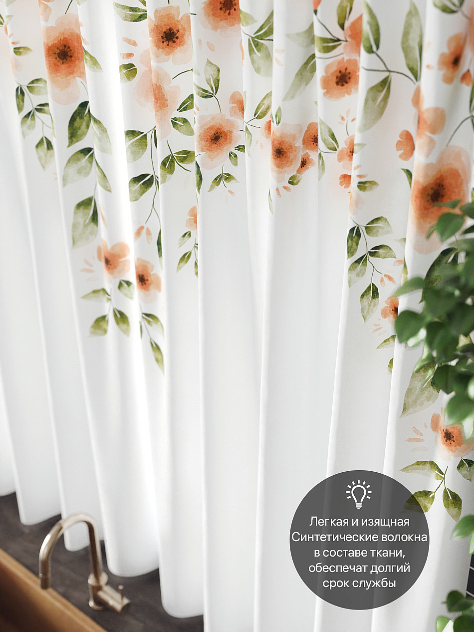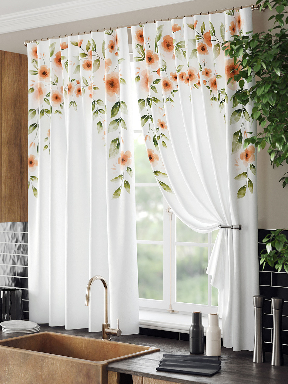 Комплект штор из легкой портьерной ткани (габардин) оформлен печатным рисунком. Печатный рисунок дает широкие возможности обновить интерьер фактически нет требуя ремонта за счет огромного выбора. Ткани с печатным рисунком безопасны и не содержат токсичных веществ. Не смотря на то что, материал легкий, он имеет высокую плотность, мало загрязнятся и не требует особого ухода даже после стирки, что важно для кухонных занавесок. Шторы не выцветают, не растягиваются, превосходно драпируются, образуя струящиеся складки. Прекрасное решение для создания красоты и уюта с помощью уникальных дизайнов.