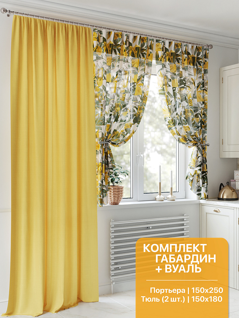 - Состав комплекта Портьера 150х250 см — 1 шт., вуаль 150х180 см — 2 шт.
