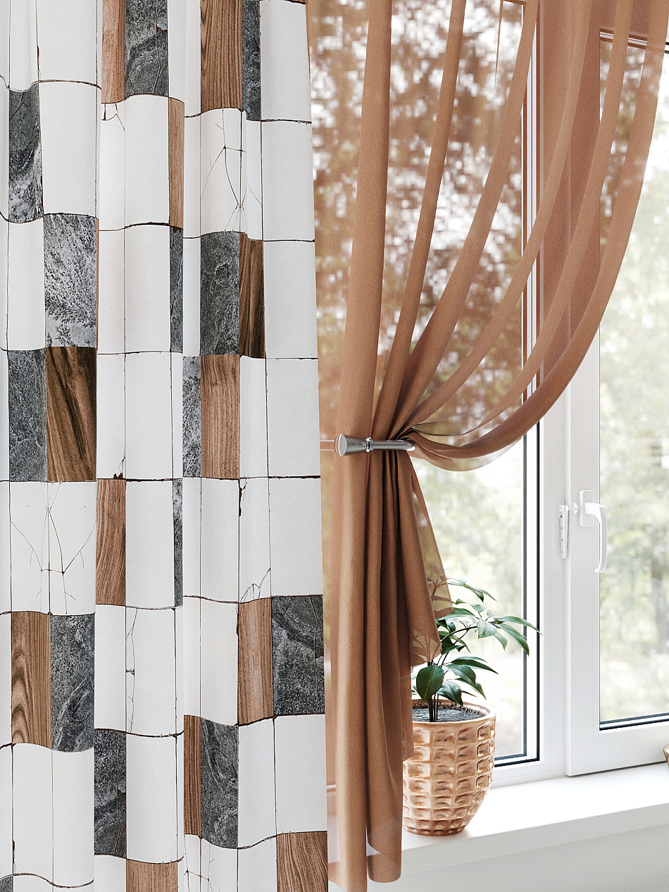 Тюль 2 шт.: Легкая основа (вуаль) оформлена геометрическим рисунком. Ширина — 150 см., высота — 180 см., крепление — шторная лента (крючки).