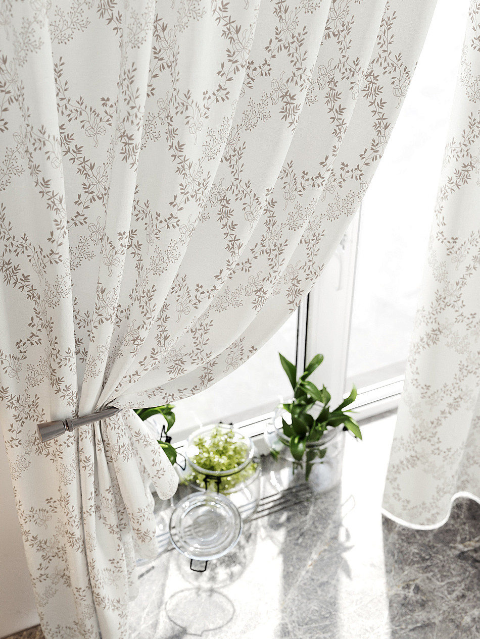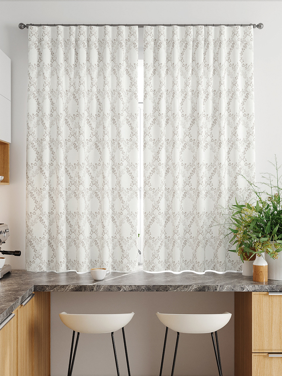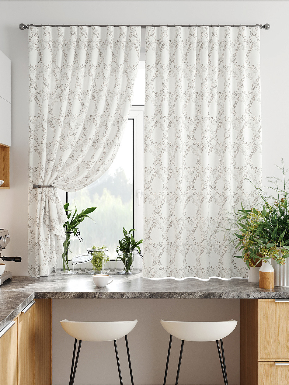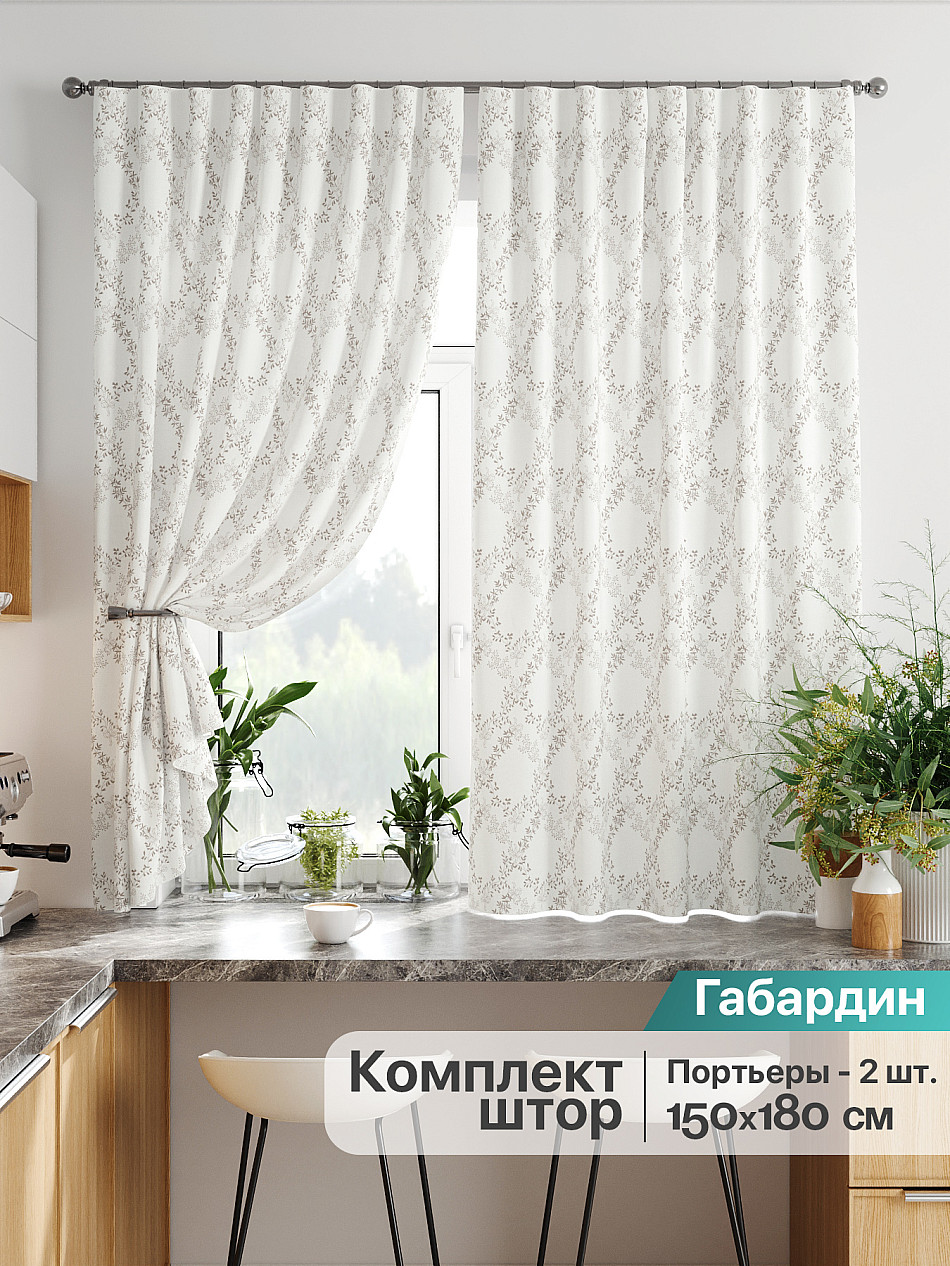 Комплект штор из легкой портьерной ткани (габардин) оформлен печатным рисунком. Печатный рисунок дает широкие возможности обновить интерьер фактически нет требуя ремонта за счет огромного выбора. Ткани с печатным рисунком безопасны и не содержат токсичных веществ. Не смотря на то что, материал легкий, он имеет высокую плотность, мало загрязнятся и не требует особого ухода даже после стирки, что важно для кухонных занавесок. Шторы не выцветают, не растягиваются, превосходно драпируются, образуя струящиеся складки. Прекрасное решение для создания красоты и уюта с помощью уникальных дизайнов.
