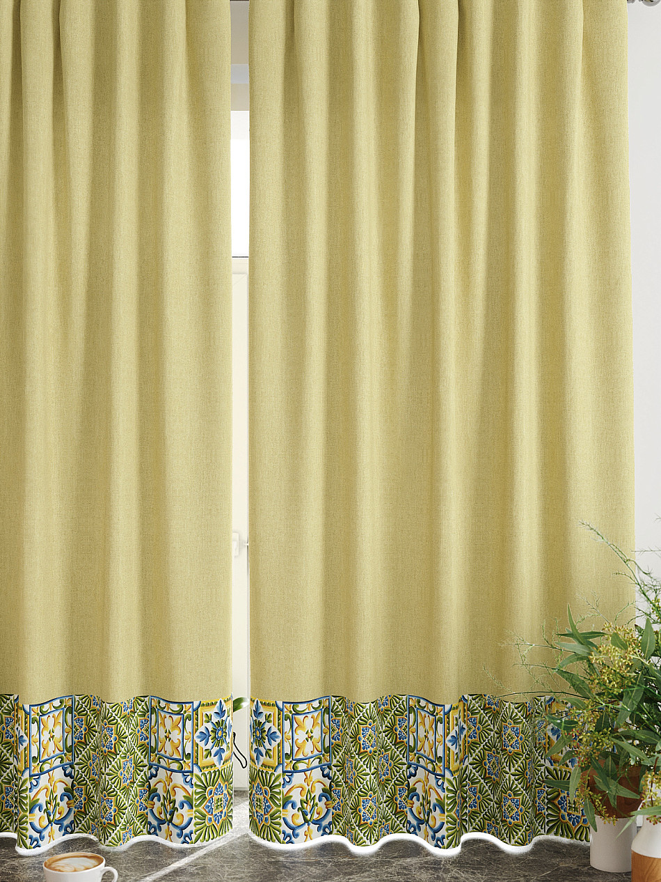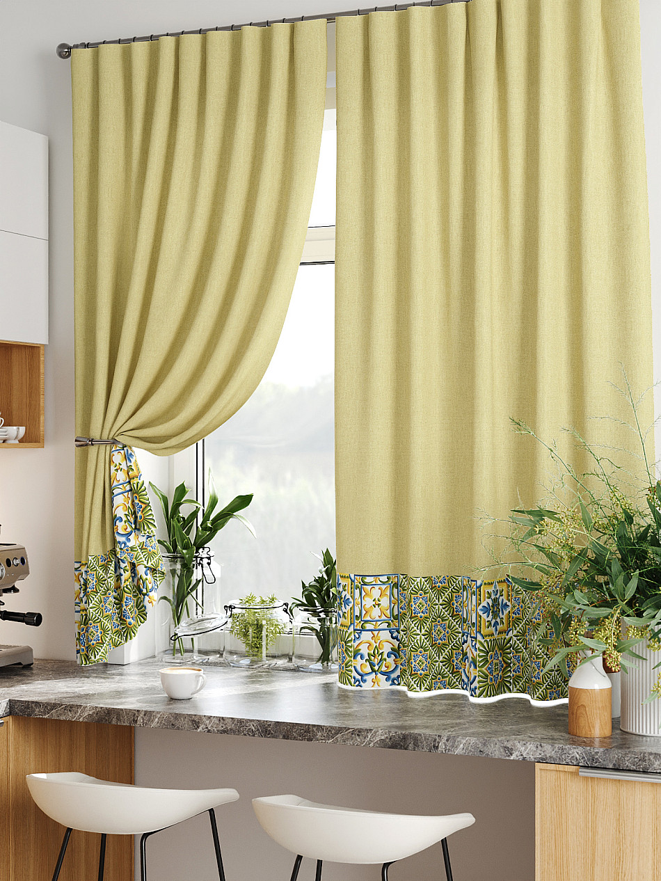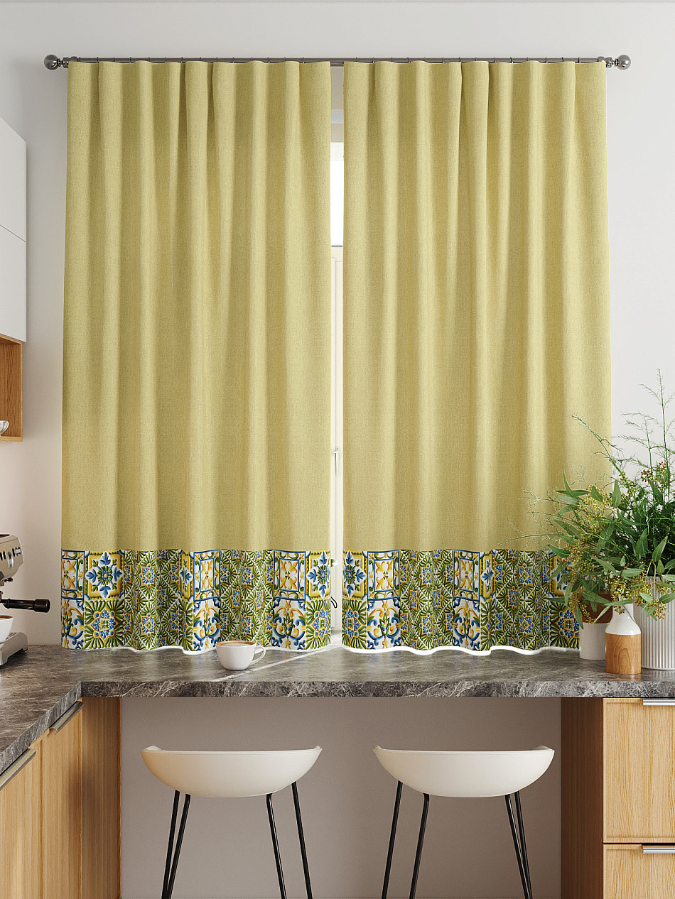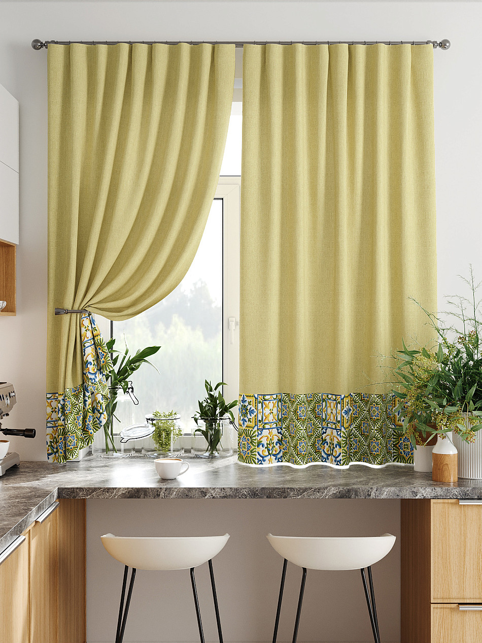 Комплект штор из легкой портьерной ткани (габардин) оформлен печатным рисунком. Печатный рисунок дает широкие возможности обновить интерьер фактически нет требуя ремонта за счет огромного выбора. Ткани с печатным рисунком безопасны и не содержат токсичных веществ. Не смотря на то что, материал легкий, он имеет высокую плотность, мало загрязнятся и не требует особого ухода даже после стирки, что важно для кухонных занавесок. Шторы не выцветают, не растягиваются, превосходно драпируются, образуя струящиеся складки. Прекрасное решение для создания красоты и уюта с помощью уникальных дизайнов.