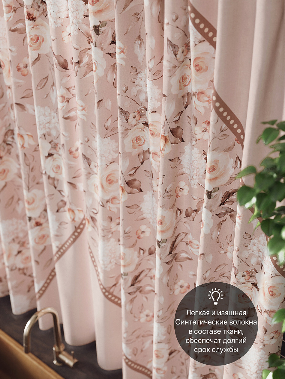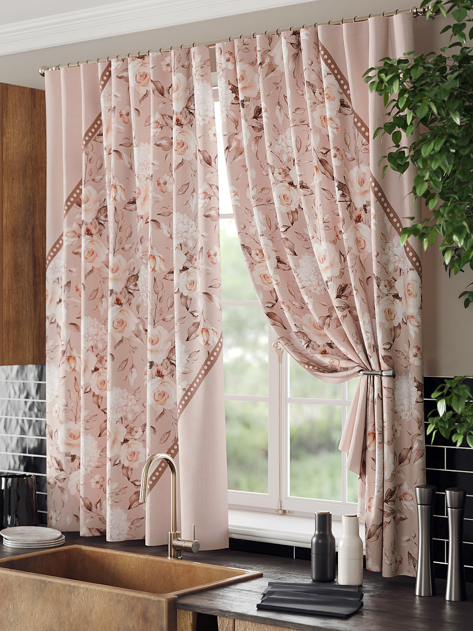 Комплект штор из легкой портьерной ткани (габардин) оформлен печатным рисунком. Печатный рисунок дает широкие возможности обновить интерьер фактически нет требуя ремонта за счет огромного выбора. Ткани с печатным рисунком безопасны и не содержат токсичных веществ. Не смотря на то что, материал легкий, он имеет высокую плотность, мало загрязнятся и не требует особого ухода даже после стирки, что важно для кухонных занавесок. Шторы не выцветают, не растягиваются, превосходно драпируются, образуя струящиеся складки. Прекрасное решение для создания красоты и уюта с помощью уникальных дизайнов.