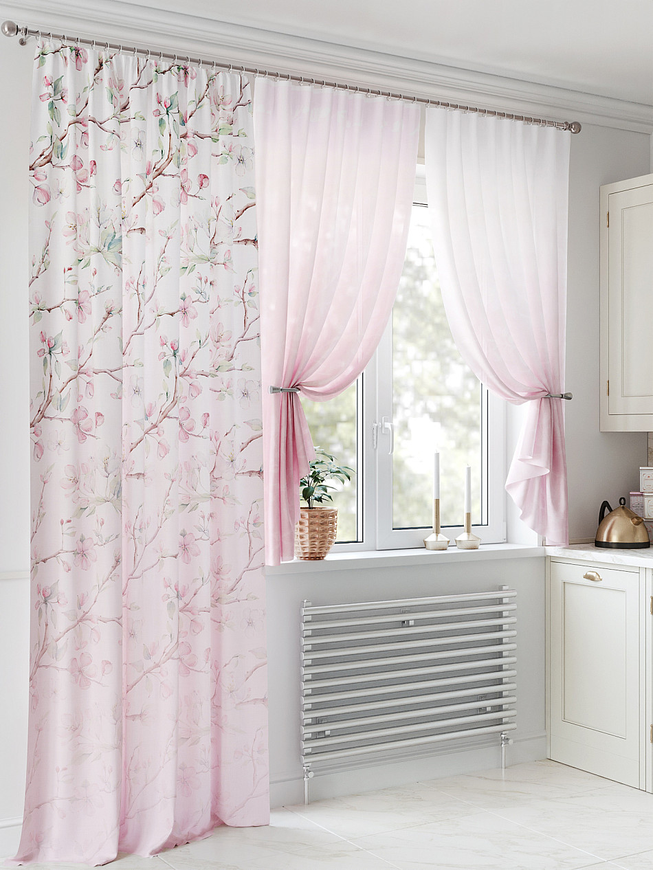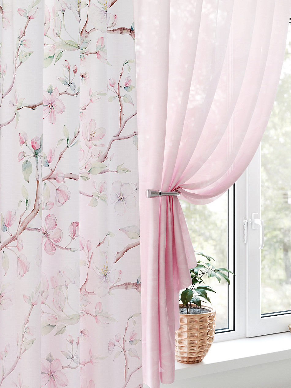 Тюль 2 шт.: Легкая основа (вуаль) оформлена флористическим рисунком. Ширина — 150 см., высота — 180 см., крепление — шторная лента (крючки).