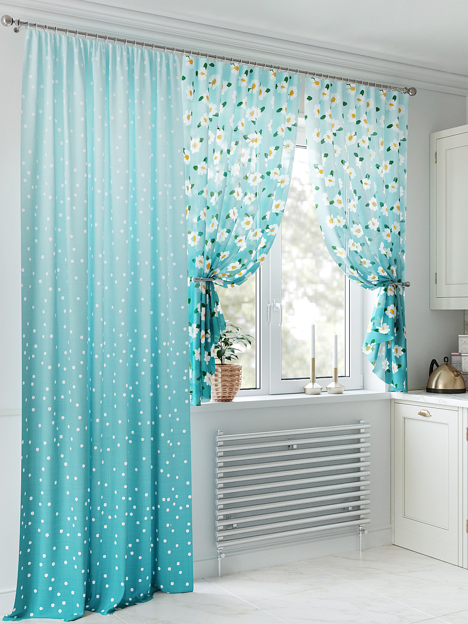Портьера 150х250 см — 1 шт., вуаль 150х180 см — 2 шт. ( Уменьшить высоту ) Крепление: шторная лента (крючки), кулиска Подробнее