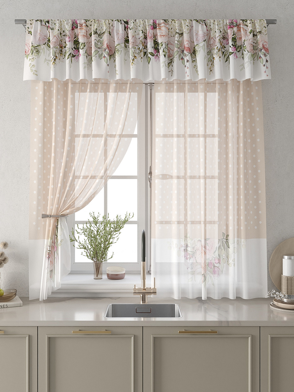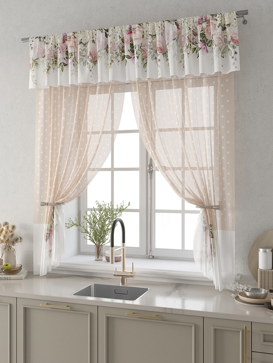 Вуаль 150х160 см. — 2 шт., Ламбрекен 300х40 см. — 1 шт. Комплект штор из вуали оформлены печатным рисунком. Печатный рисунок дает широкие возможности обновить интерьер фактически не требуя ремонта за счет огромного выбора. Ткани с печатным рисунком безопасны и не содержат токсичных веществ. Не смотря на то, что материал легкий, он имеет высокую плотность, мало загрязнятся и не требует особого ухода даже после стирки, что важно для кухонных занавесок. Тюль не выцветает, не растягивается, превосходно драпируются, образуя струящиеся складки. Прекрасное решение для создания красоты и уюта с помощью уникальных дизайнов.