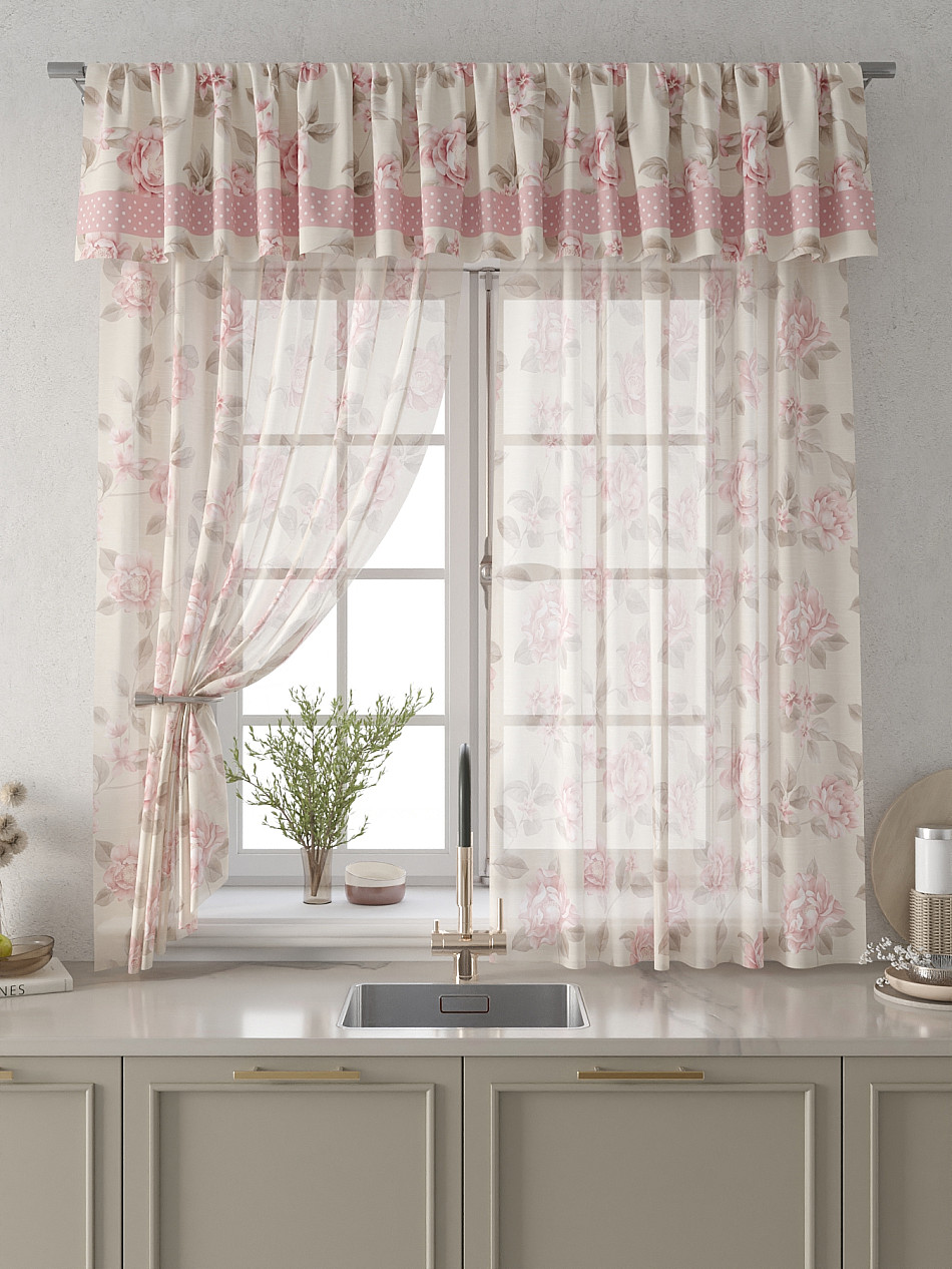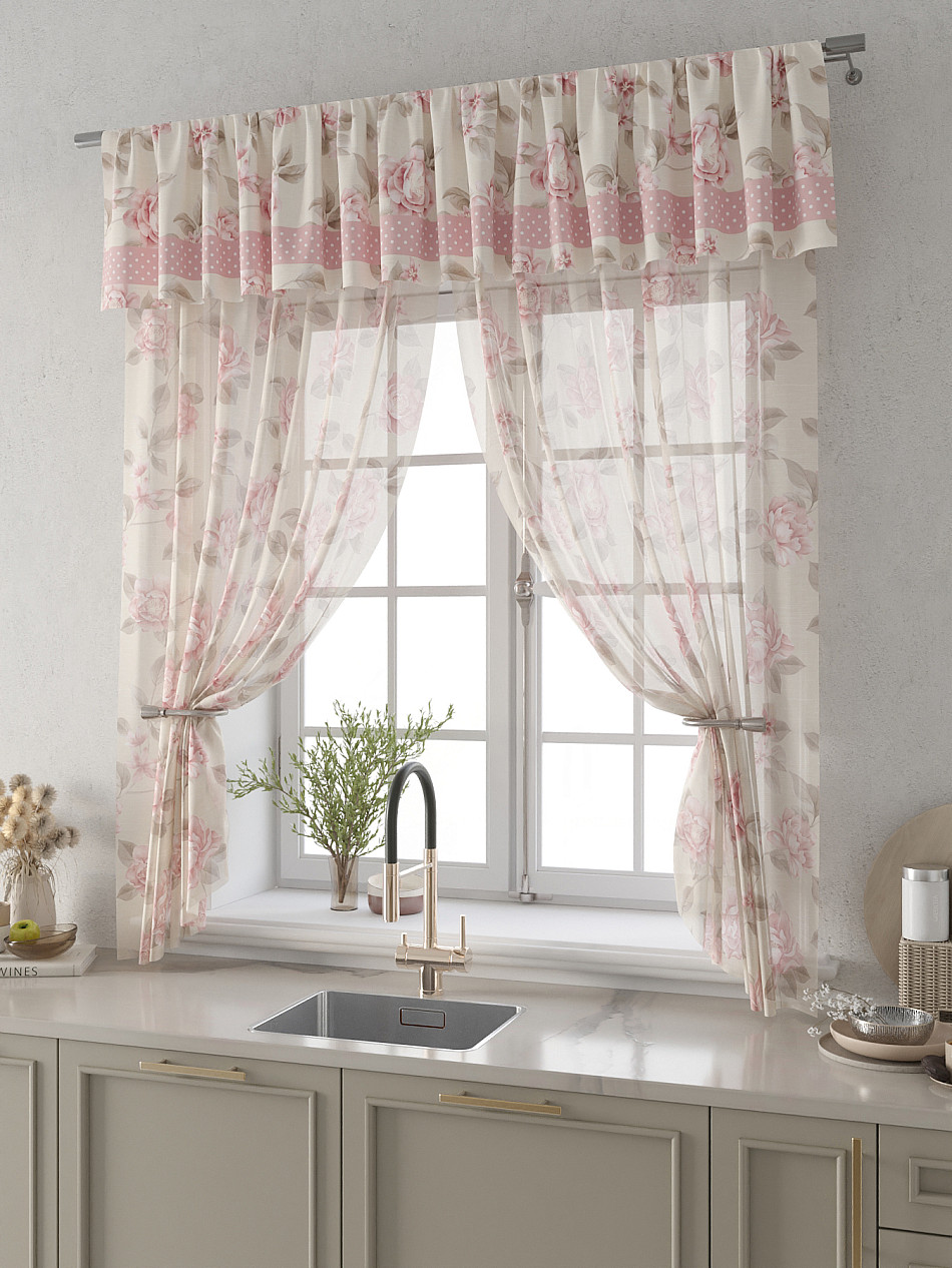 Вуаль 150х160 см. — 2 шт., Ламбрекен 300х40 см. — 1 шт. Комплект штор из вуали оформлены печатным рисунком. Печатный рисунок дает широкие возможности обновить интерьер фактически не требуя ремонта за счет огромного выбора. Ткани с печатным рисунком безопасны и не содержат токсичных веществ. Не смотря на то, что материал легкий, он имеет высокую плотность, мало загрязнятся и не требует особого ухода даже после стирки, что важно для кухонных занавесок. Тюль не выцветает, не растягивается, превосходно драпируются, образуя струящиеся складки. Прекрасное решение для создания красоты и уюта с помощью уникальных дизайнов.