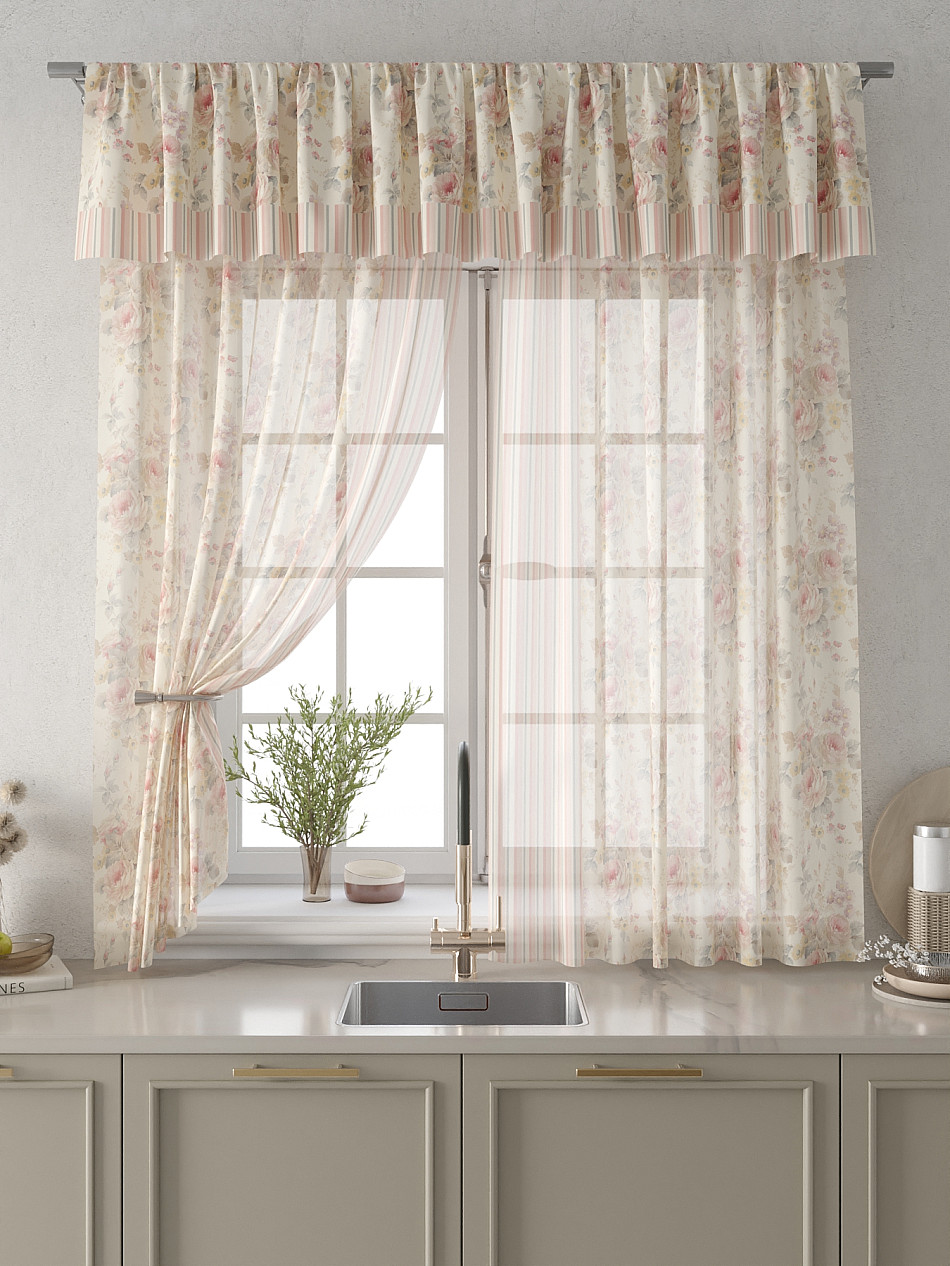 Вуаль 150х180 см. — 2 шт., Ламбрекен 300х40 см. — 1 шт. Комплект штор из вуали оформлены печатным рисунком. Печатный рисунок дает широкие возможности обновить интерьер фактически не требуя ремонта за счет огромного выбора. Ткани с печатным рисунком безопасны и не содержат токсичных веществ. Не смотря на то, что материал легкий, он имеет высокую плотность, мало загрязнятся и не требует особого ухода даже после стирки, что важно для кухонных занавесок. Тюль не выцветает, не растягивается, превосходно драпируются, образуя струящиеся складки. Прекрасное решение для создания красоты и уюта с помощью уникальных дизайнов.