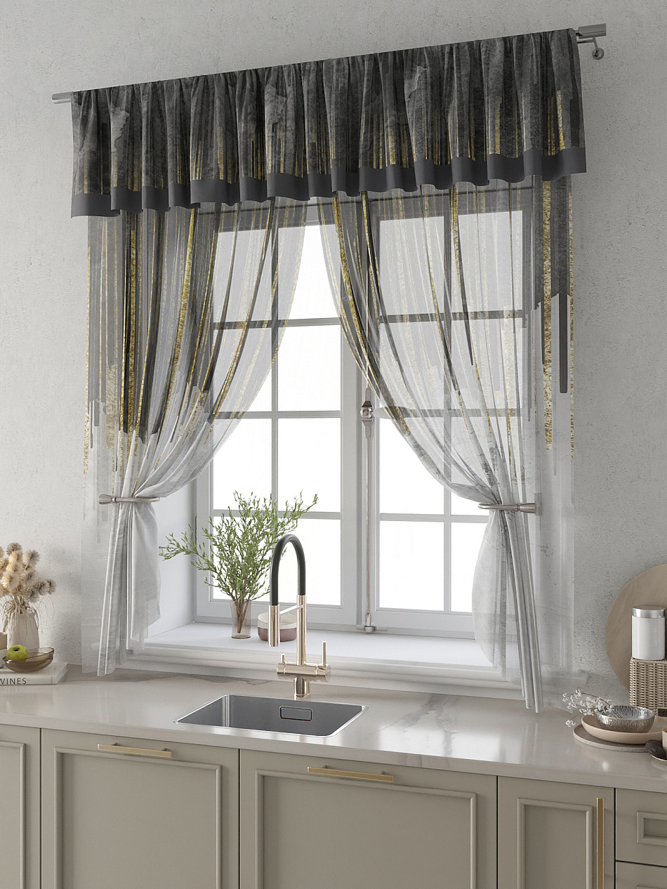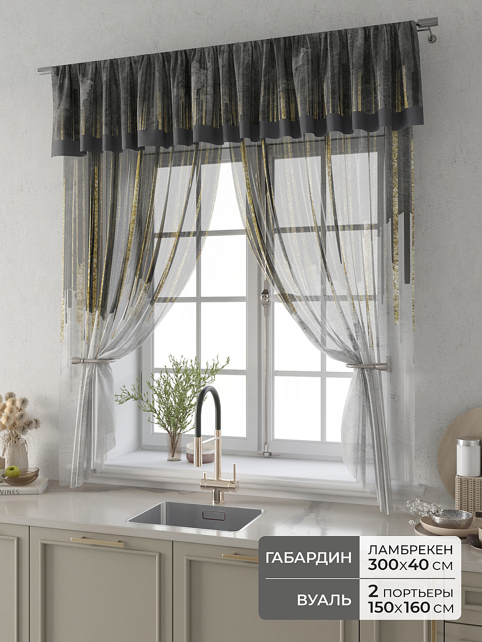 - Состав комплекта Вуаль 150х160 см — 2 шт., Ламбрекен 300х40 см — 1 шт.