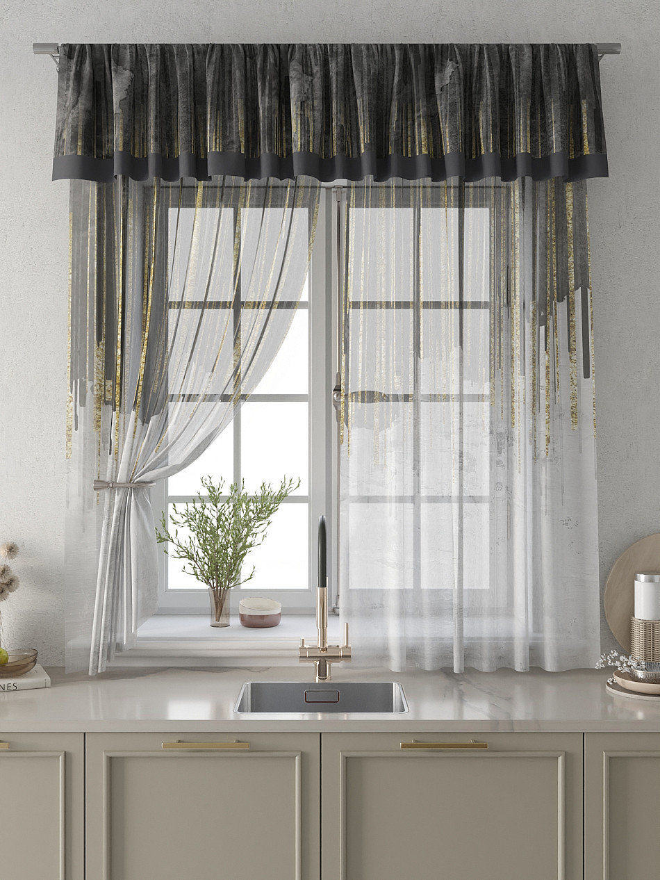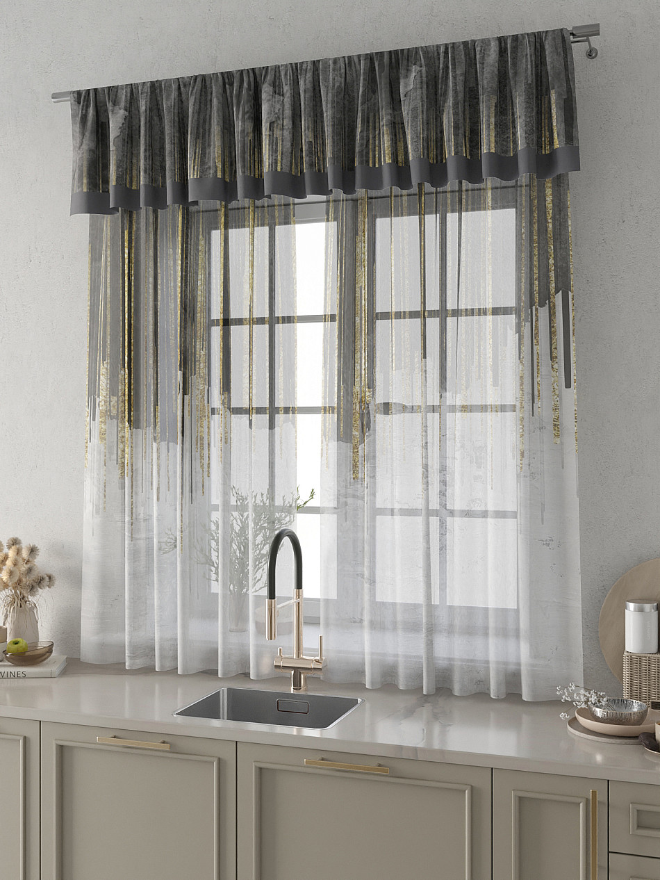 Вуаль 150х160 см. — 2 шт., Ламбрекен 300х40 см. — 1 шт. Комплект штор из вуали оформлены печатным рисунком. Печатный рисунок дает широкие возможности обновить интерьер фактически не требуя ремонта за счет огромного выбора. Ткани с печатным рисунком безопасны и не содержат токсичных веществ. Не смотря на то, что материал легкий, он имеет высокую плотность, мало загрязнятся и не требует особого ухода даже после стирки, что важно для кухонных занавесок. Тюль не выцветает, не растягивается, превосходно драпируются, образуя струящиеся складки. Прекрасное решение для создания красоты и уюта с помощью уникальных дизайнов.