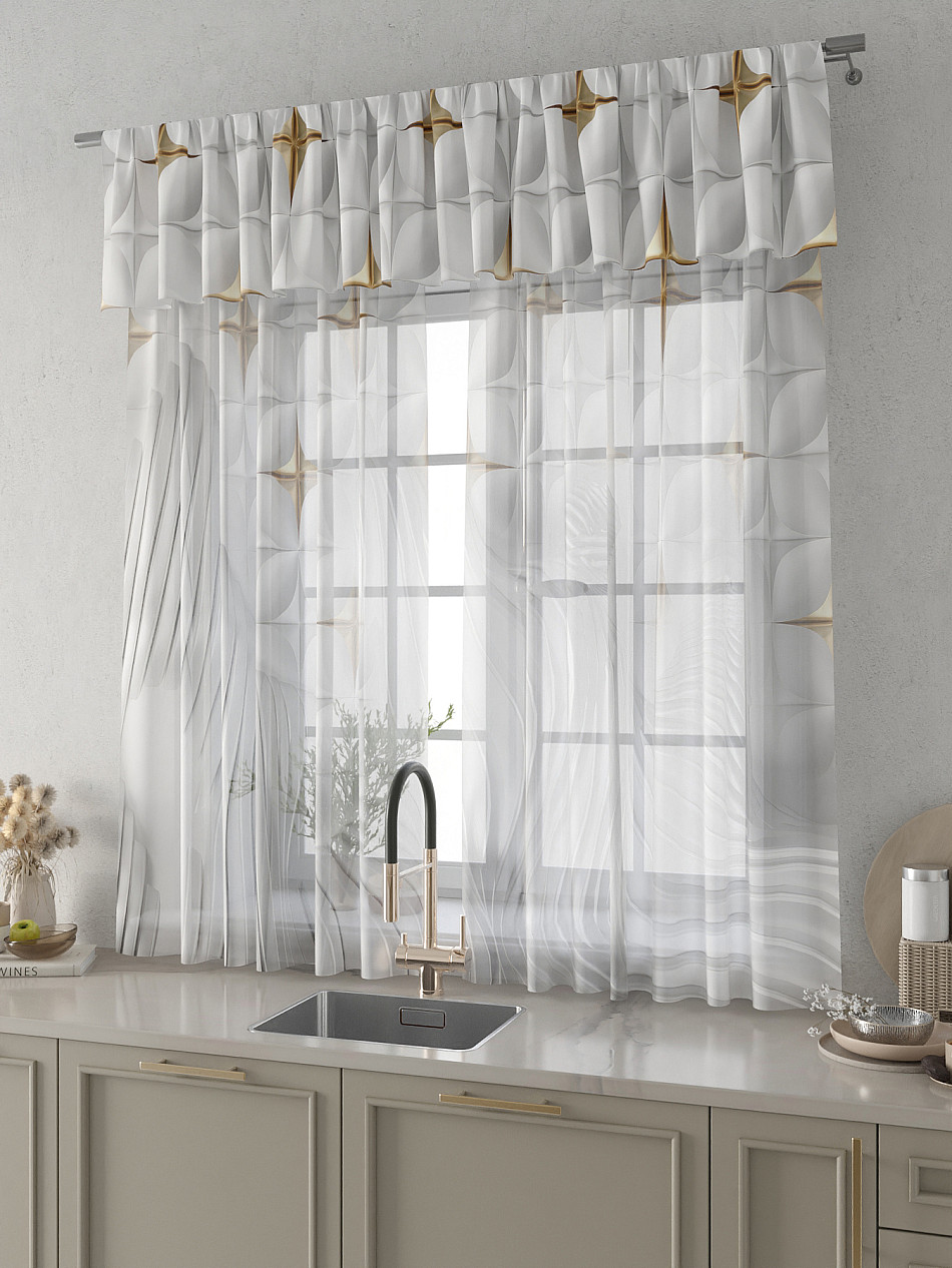 Вуаль 150х160 см. — 2 шт., Ламбрекен 300х40 см. — 1 шт. Комплект штор из вуали оформлены печатным рисунком. Печатный рисунок дает широкие возможности обновить интерьер фактически не требуя ремонта за счет огромного выбора. Ткани с печатным рисунком безопасны и не содержат токсичных веществ. Не смотря на то, что материал легкий, он имеет высокую плотность, мало загрязнятся и не требует особого ухода даже после стирки, что важно для кухонных занавесок. Тюль не выцветает, не растягивается, превосходно драпируются, образуя струящиеся складки. Прекрасное решение для создания красоты и уюта с помощью уникальных дизайнов.