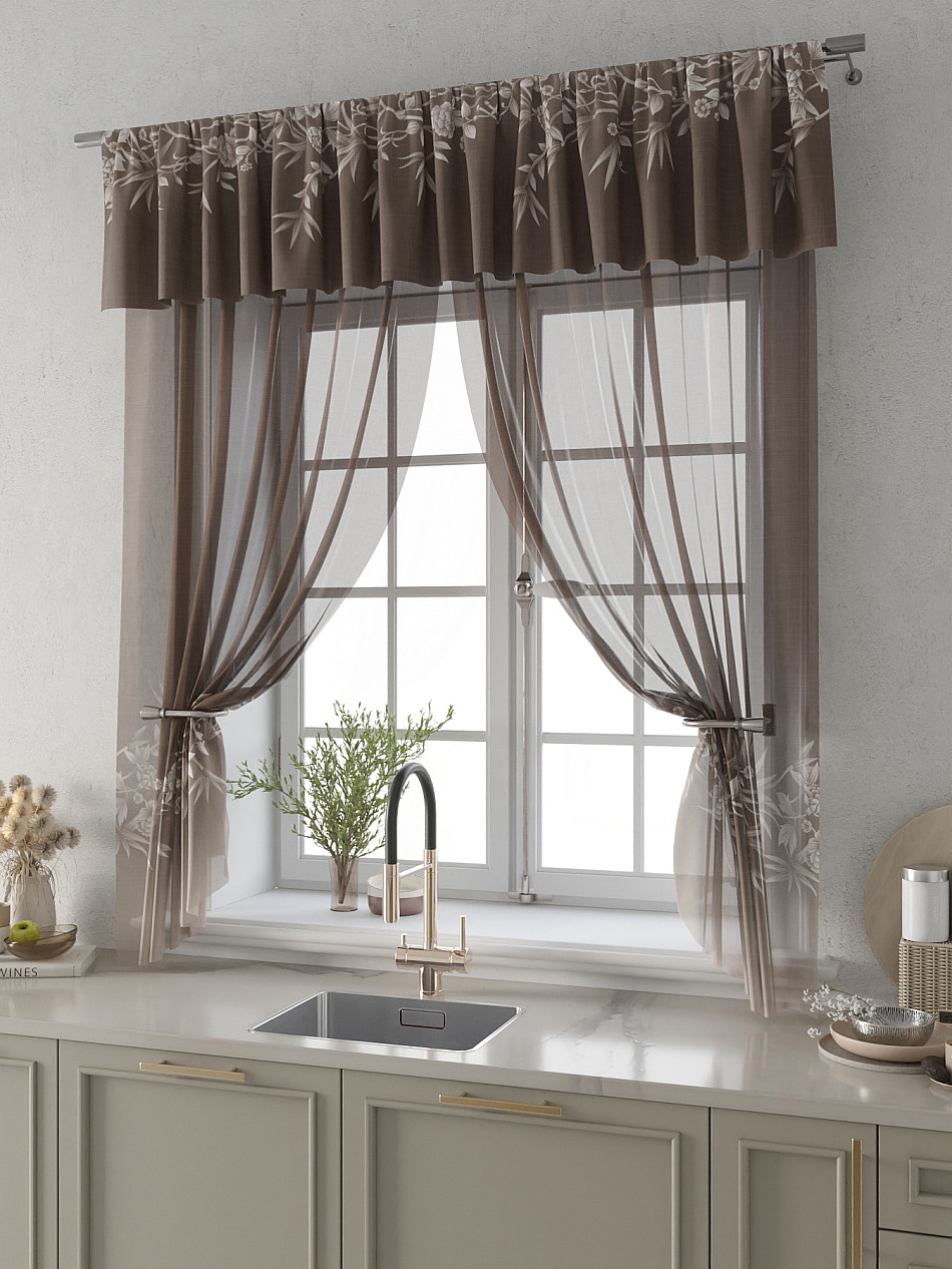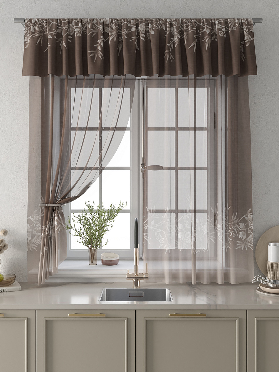 Вуаль 150х160 см. — 2 шт., Ламбрекен 300х40 см. — 1 шт. Комплект штор из вуали оформлены печатным рисунком. Печатный рисунок дает широкие возможности обновить интерьер фактически не требуя ремонта за счет огромного выбора. Ткани с печатным рисунком безопасны и не содержат токсичных веществ. Не смотря на то, что материал легкий, он имеет высокую плотность, мало загрязнятся и не требует особого ухода даже после стирки, что важно для кухонных занавесок. Тюль не выцветает, не растягивается, превосходно драпируются, образуя струящиеся складки. Прекрасное решение для создания красоты и уюта с помощью уникальных дизайнов.