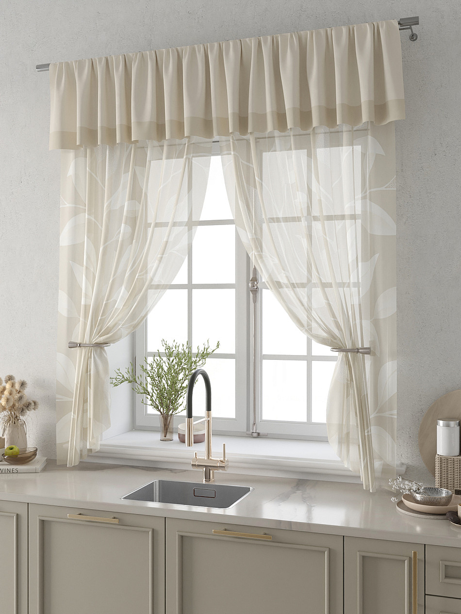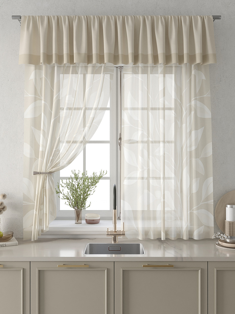 Вуаль 150х160 см. — 2 шт., Ламбрекен 300х40 см. — 1 шт. Комплект штор из вуали оформлены печатным рисунком. Печатный рисунок дает широкие возможности обновить интерьер фактически не требуя ремонта за счет огромного выбора. Ткани с печатным рисунком безопасны и не содержат токсичных веществ. Не смотря на то, что материал легкий, он имеет высокую плотность, мало загрязнятся и не требует особого ухода даже после стирки, что важно для кухонных занавесок. Тюль не выцветает, не растягивается, превосходно драпируются, образуя струящиеся складки. Прекрасное решение для создания красоты и уюта с помощью уникальных дизайнов.