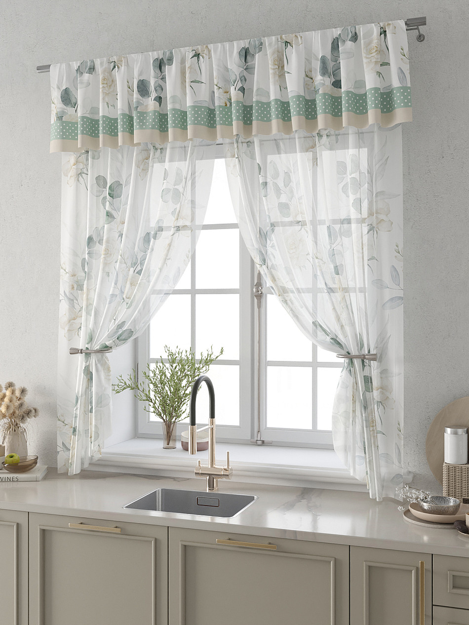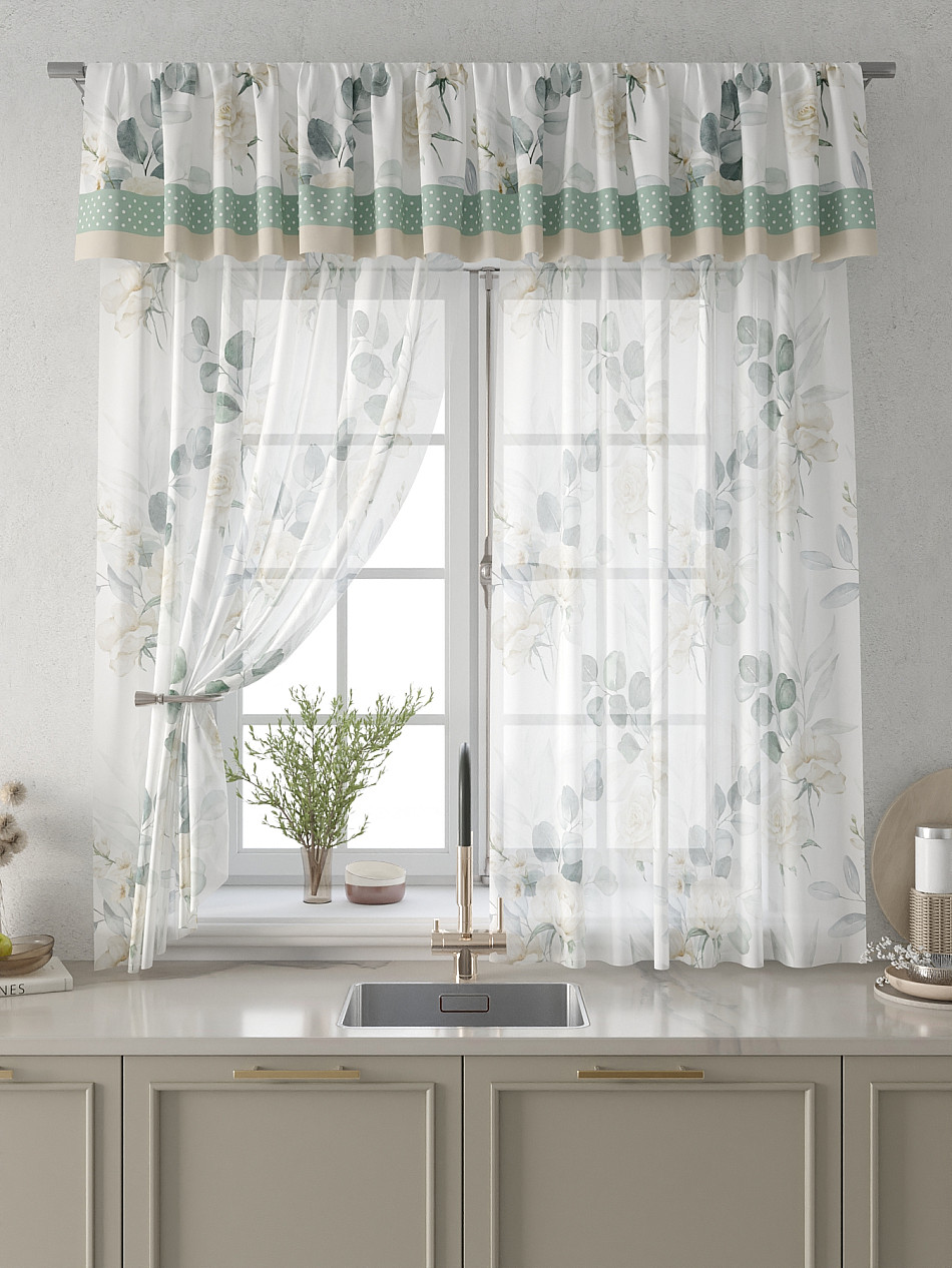Вуаль 150х180 см. — 2 шт., Ламбрекен 300х40 см. — 1 шт. Комплект штор из вуали оформлены печатным рисунком. Печатный рисунок дает широкие возможности обновить интерьер фактически не требуя ремонта за счет огромного выбора. Ткани с печатным рисунком безопасны и не содержат токсичных веществ. Не смотря на то, что материал легкий, он имеет высокую плотность, мало загрязнятся и не требует особого ухода даже после стирки, что важно для кухонных занавесок. Тюль не выцветает, не растягивается, превосходно драпируются, образуя струящиеся складки. Прекрасное решение для создания красоты и уюта с помощью уникальных дизайнов.