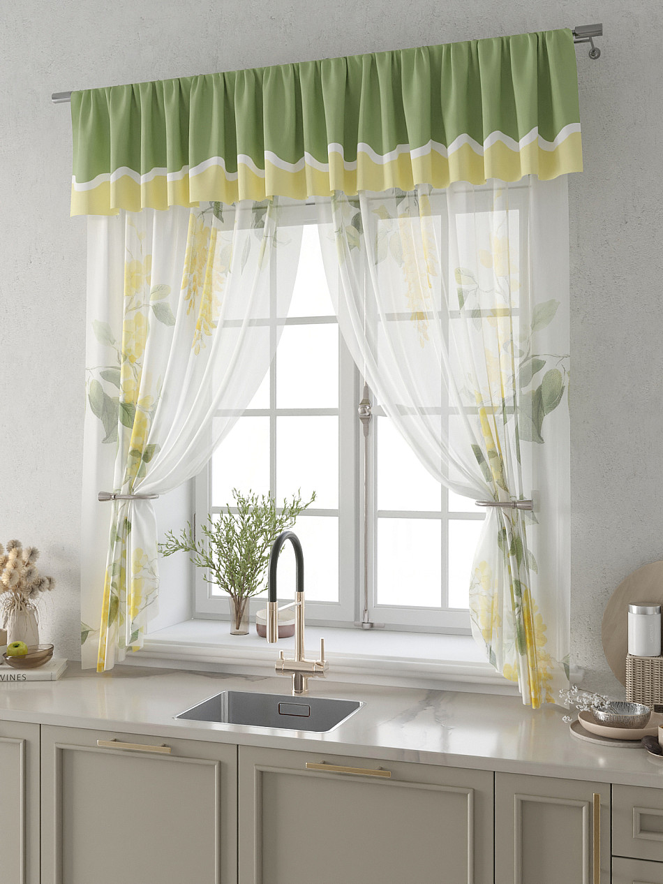 Вуаль 150х180 см. — 2 шт., Ламбрекен 300х40 см. — 1 шт. Комплект штор из вуали оформлены печатным рисунком. Печатный рисунок дает широкие возможности обновить интерьер фактически не требуя ремонта за счет огромного выбора. Ткани с печатным рисунком безопасны и не содержат токсичных веществ. Не смотря на то, что материал легкий, он имеет высокую плотность, мало загрязнятся и не требует особого ухода даже после стирки, что важно для кухонных занавесок. Тюль не выцветает, не растягивается, превосходно драпируются, образуя струящиеся складки. Прекрасное решение для создания красоты и уюта с помощью уникальных дизайнов.