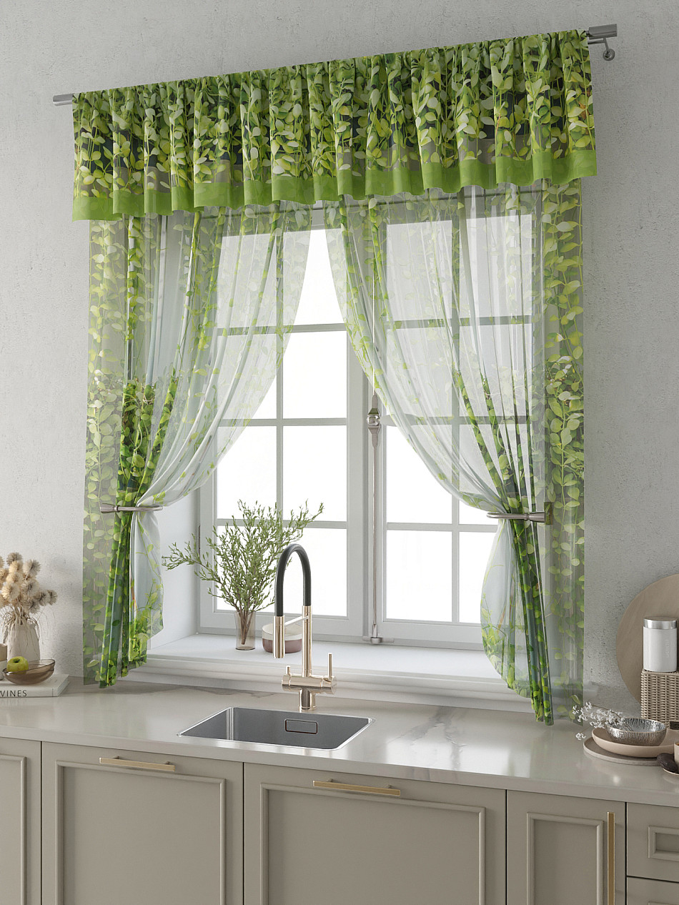 Вуаль 150х180 см. — 2 шт., Ламбрекен 300х40 см. — 1 шт. Комплект штор из вуали оформлены печатным рисунком. Печатный рисунок дает широкие возможности обновить интерьер фактически не требуя ремонта за счет огромного выбора. Ткани с печатным рисунком безопасны и не содержат токсичных веществ. Не смотря на то, что материал легкий, он имеет высокую плотность, мало загрязнятся и не требует особого ухода даже после стирки, что важно для кухонных занавесок. Тюль не выцветает, не растягивается, превосходно драпируются, образуя струящиеся складки. Прекрасное решение для создания красоты и уюта с помощью уникальных дизайнов.
