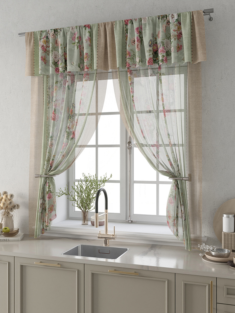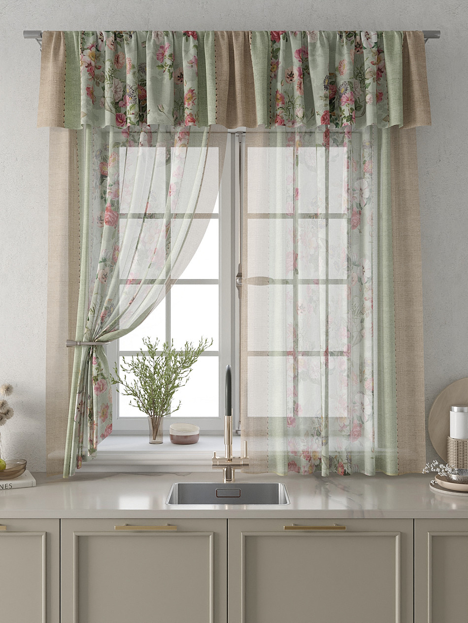 Вуаль 150х160 см. — 2 шт., Ламбрекен 300х40 см. — 1 шт. Комплект штор из вуали оформлены печатным рисунком. Печатный рисунок дает широкие возможности обновить интерьер фактически не требуя ремонта за счет огромного выбора. Ткани с печатным рисунком безопасны и не содержат токсичных веществ. Не смотря на то, что материал легкий, он имеет высокую плотность, мало загрязнятся и не требует особого ухода даже после стирки, что важно для кухонных занавесок. Тюль не выцветает, не растягивается, превосходно драпируются, образуя струящиеся складки. Прекрасное решение для создания красоты и уюта с помощью уникальных дизайнов.