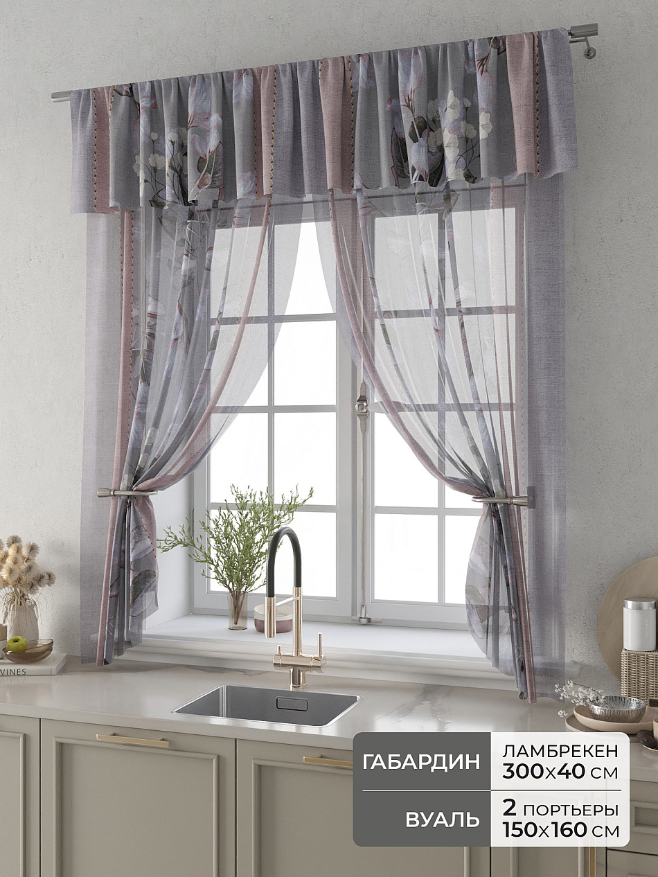 - Состав комплекта Вуаль 150х160 см — 2 шт., Ламбрекен 300х40 см — 1 шт.