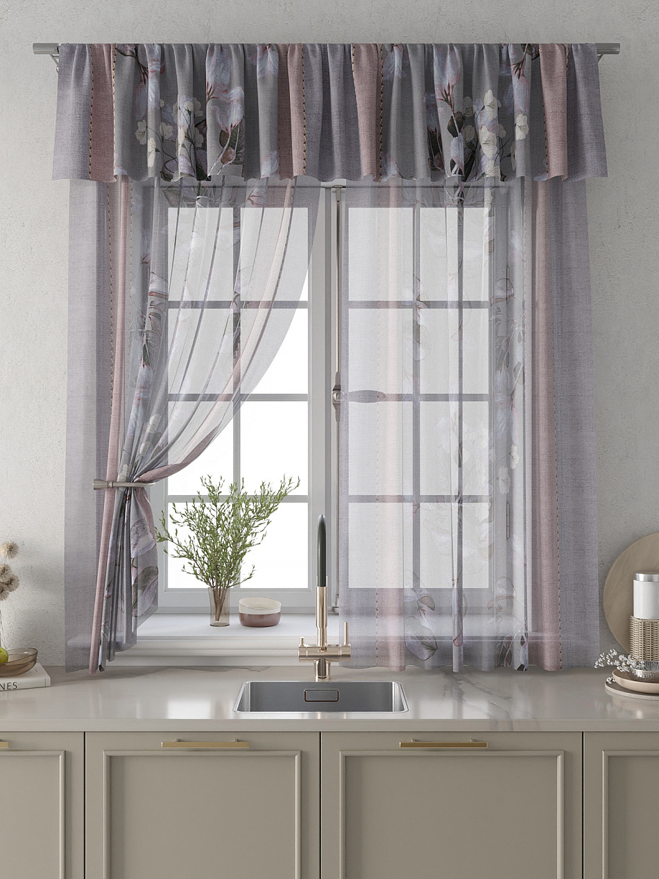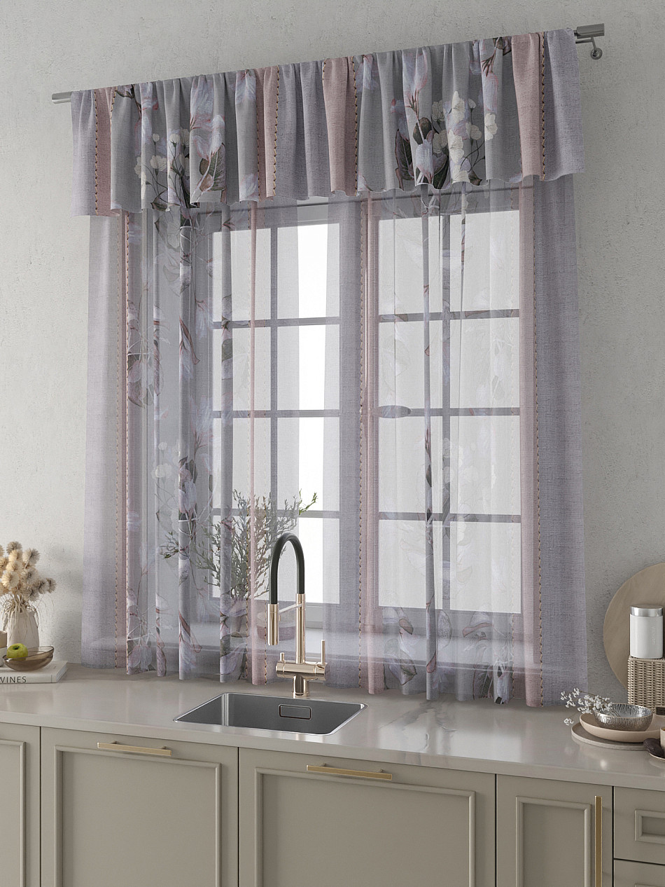 Вуаль 150х160 см. — 2 шт., Ламбрекен 300х40 см. — 1 шт. Комплект штор из вуали оформлены печатным рисунком. Печатный рисунок дает широкие возможности обновить интерьер фактически не требуя ремонта за счет огромного выбора. Ткани с печатным рисунком безопасны и не содержат токсичных веществ. Не смотря на то, что материал легкий, он имеет высокую плотность, мало загрязнятся и не требует особого ухода даже после стирки, что важно для кухонных занавесок. Тюль не выцветает, не растягивается, превосходно драпируются, образуя струящиеся складки. Прекрасное решение для создания красоты и уюта с помощью уникальных дизайнов.