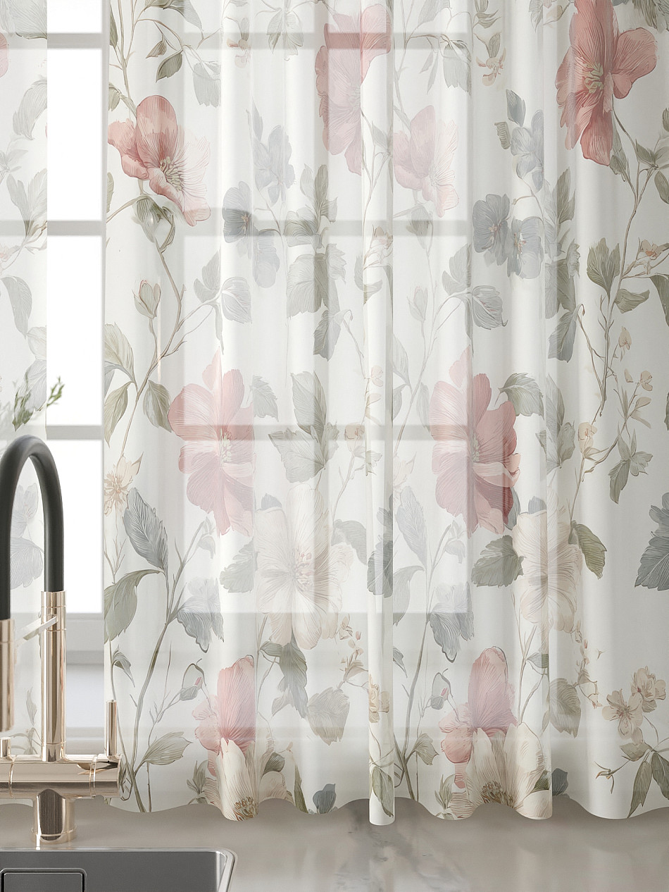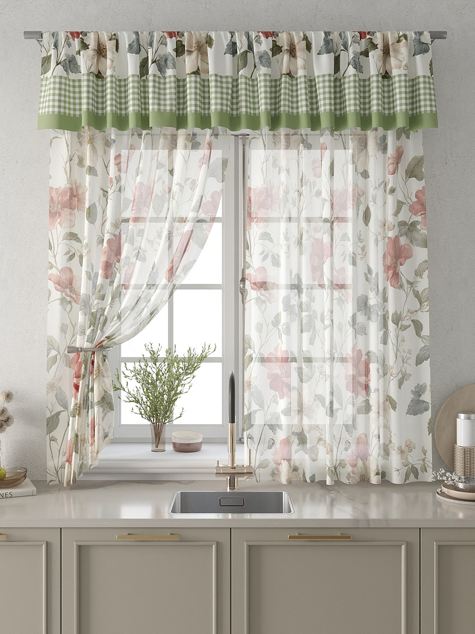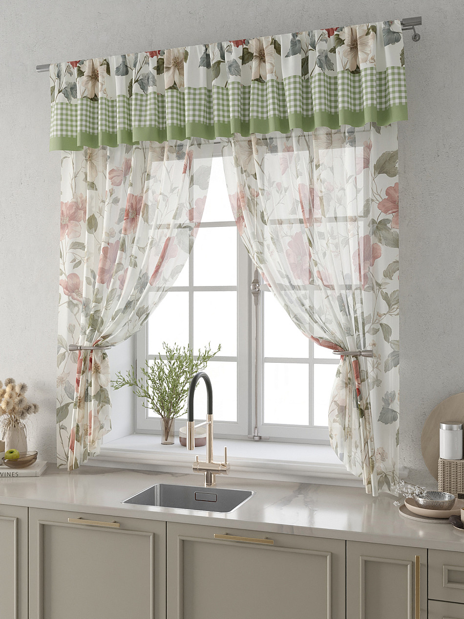 Вуаль 150х160 см. — 2 шт., Ламбрекен 300х40 см. — 1 шт. Комплект штор из вуали оформлены печатным рисунком. Печатный рисунок дает широкие возможности обновить интерьер фактически не требуя ремонта за счет огромного выбора. Ткани с печатным рисунком безопасны и не содержат токсичных веществ. Не смотря на то, что материал легкий, он имеет высокую плотность, мало загрязнятся и не требует особого ухода даже после стирки, что важно для кухонных занавесок. Тюль не выцветает, не растягивается, превосходно драпируются, образуя струящиеся складки. Прекрасное решение для создания красоты и уюта с помощью уникальных дизайнов.
