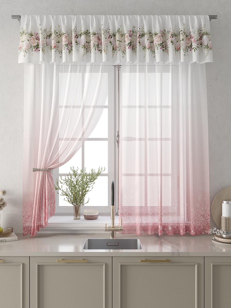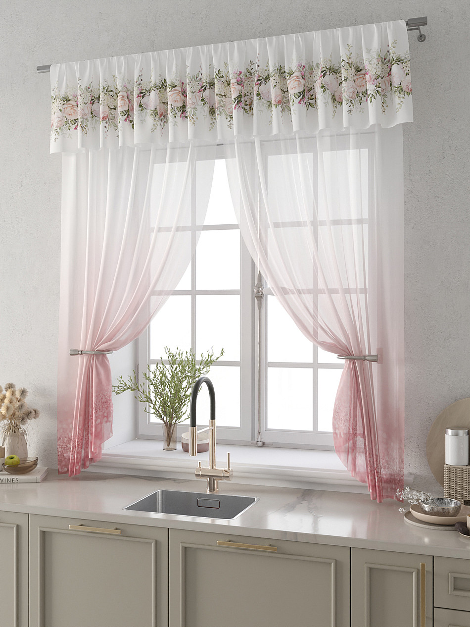Вуаль 150х160 см. — 2 шт., Ламбрекен 300х40 см. — 1 шт. Комплект штор из вуали оформлены печатным рисунком. Печатный рисунок дает широкие возможности обновить интерьер фактически не требуя ремонта за счет огромного выбора. Ткани с печатным рисунком безопасны и не содержат токсичных веществ. Не смотря на то, что материал легкий, он имеет высокую плотность, мало загрязнятся и не требует особого ухода даже после стирки, что важно для кухонных занавесок. Тюль не выцветает, не растягивается, превосходно драпируются, образуя струящиеся складки. Прекрасное решение для создания красоты и уюта с помощью уникальных дизайнов.