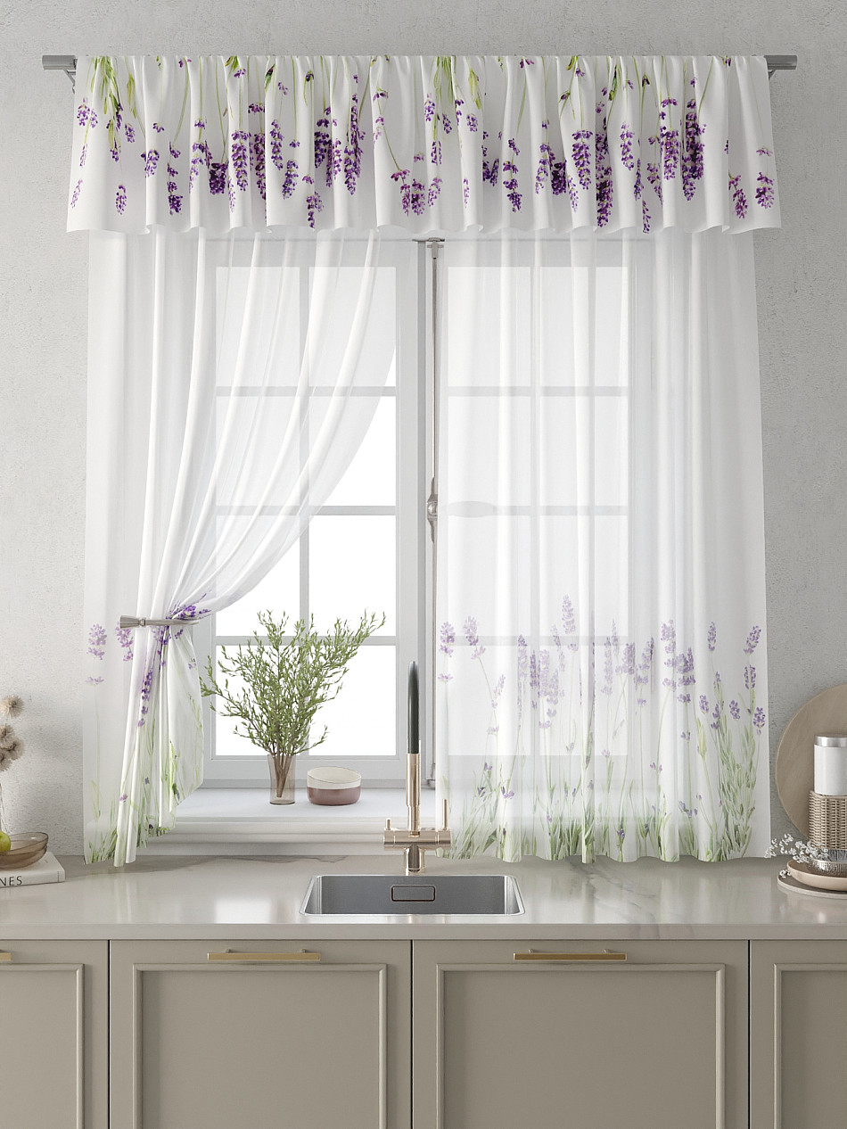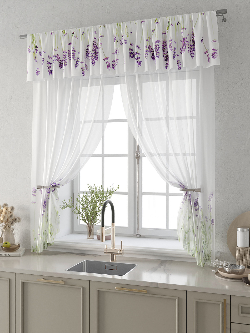 Вуаль 150х160 см. — 2 шт., Ламбрекен 300х40 см. — 1 шт. Комплект штор из вуали оформлены печатным рисунком. Печатный рисунок дает широкие возможности обновить интерьер фактически не требуя ремонта за счет огромного выбора. Ткани с печатным рисунком безопасны и не содержат токсичных веществ. Не смотря на то, что материал легкий, он имеет высокую плотность, мало загрязнятся и не требует особого ухода даже после стирки, что важно для кухонных занавесок. Тюль не выцветает, не растягивается, превосходно драпируются, образуя струящиеся складки. Прекрасное решение для создания красоты и уюта с помощью уникальных дизайнов.