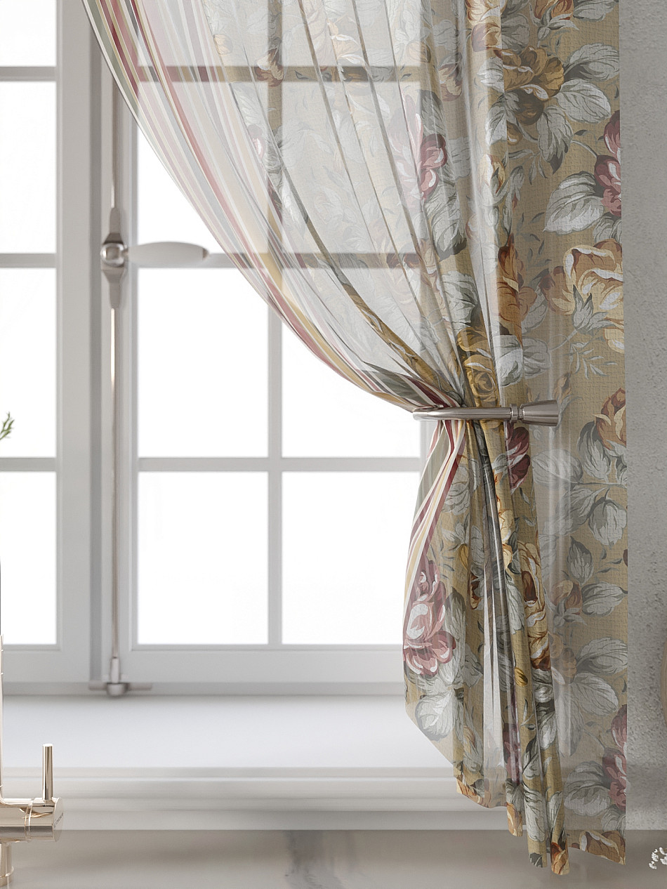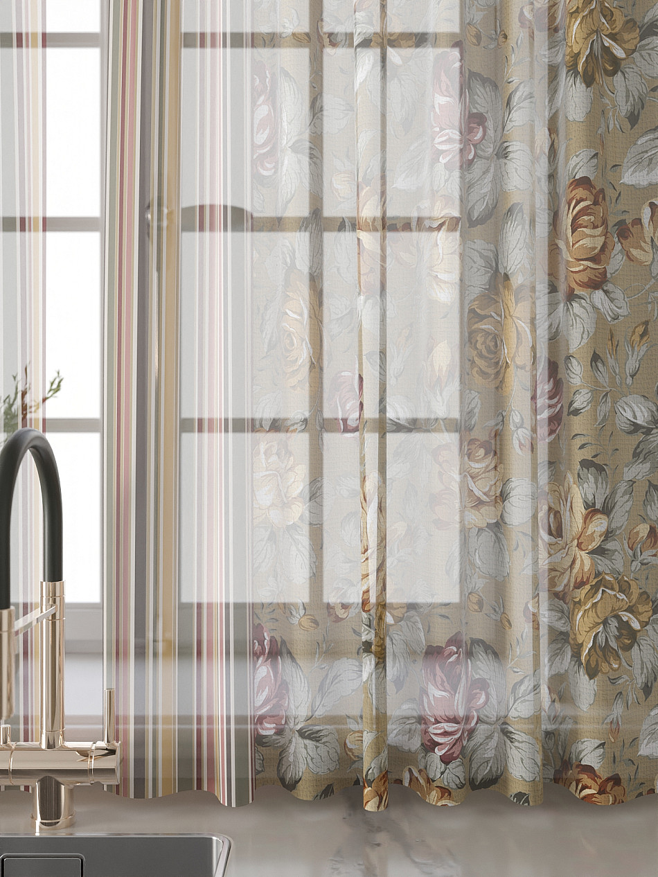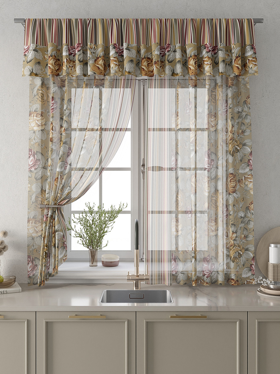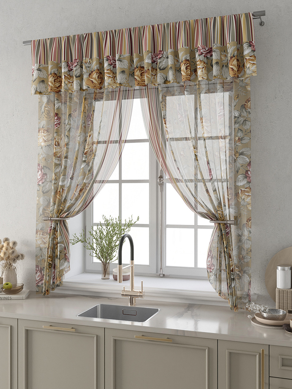 Вуаль 150х180 см. — 2 шт., Ламбрекен 300х40 см. — 1 шт. Комплект штор из вуали оформлены печатным рисунком. Печатный рисунок дает широкие возможности обновить интерьер фактически не требуя ремонта за счет огромного выбора. Ткани с печатным рисунком безопасны и не содержат токсичных веществ. Не смотря на то, что материал легкий, он имеет высокую плотность, мало загрязнятся и не требует особого ухода даже после стирки, что важно для кухонных занавесок. Тюль не выцветает, не растягивается, превосходно драпируются, образуя струящиеся складки. Прекрасное решение для создания красоты и уюта с помощью уникальных дизайнов.