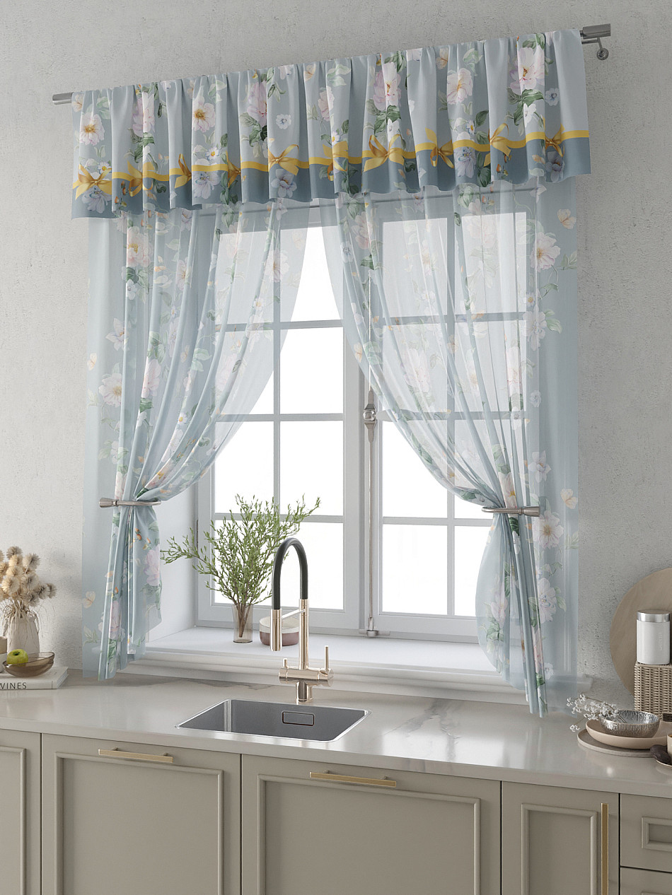 Вуаль 150х180 см. — 2 шт., Ламбрекен 300х40 см. — 1 шт. Комплект штор из вуали оформлены печатным рисунком. Печатный рисунок дает широкие возможности обновить интерьер фактически не требуя ремонта за счет огромного выбора. Ткани с печатным рисунком безопасны и не содержат токсичных веществ. Не смотря на то, что материал легкий, он имеет высокую плотность, мало загрязнятся и не требует особого ухода даже после стирки, что важно для кухонных занавесок. Тюль не выцветает, не растягивается, превосходно драпируются, образуя струящиеся складки. Прекрасное решение для создания красоты и уюта с помощью уникальных дизайнов.