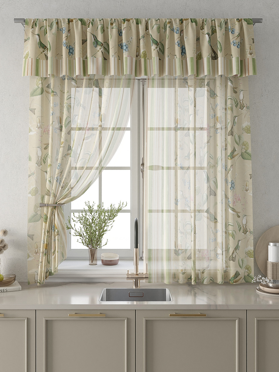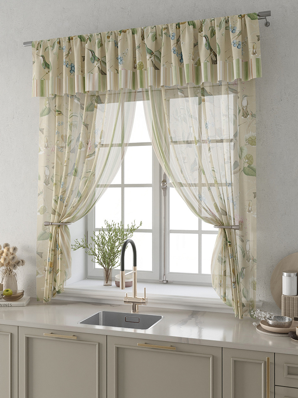 Вуаль 150х180 см. — 2 шт., Ламбрекен 300х40 см. — 1 шт. Комплект штор из вуали оформлены печатным рисунком. Печатный рисунок дает широкие возможности обновить интерьер фактически не требуя ремонта за счет огромного выбора. Ткани с печатным рисунком безопасны и не содержат токсичных веществ. Не смотря на то, что материал легкий, он имеет высокую плотность, мало загрязнятся и не требует особого ухода даже после стирки, что важно для кухонных занавесок. Тюль не выцветает, не растягивается, превосходно драпируются, образуя струящиеся складки. Прекрасное решение для создания красоты и уюта с помощью уникальных дизайнов.