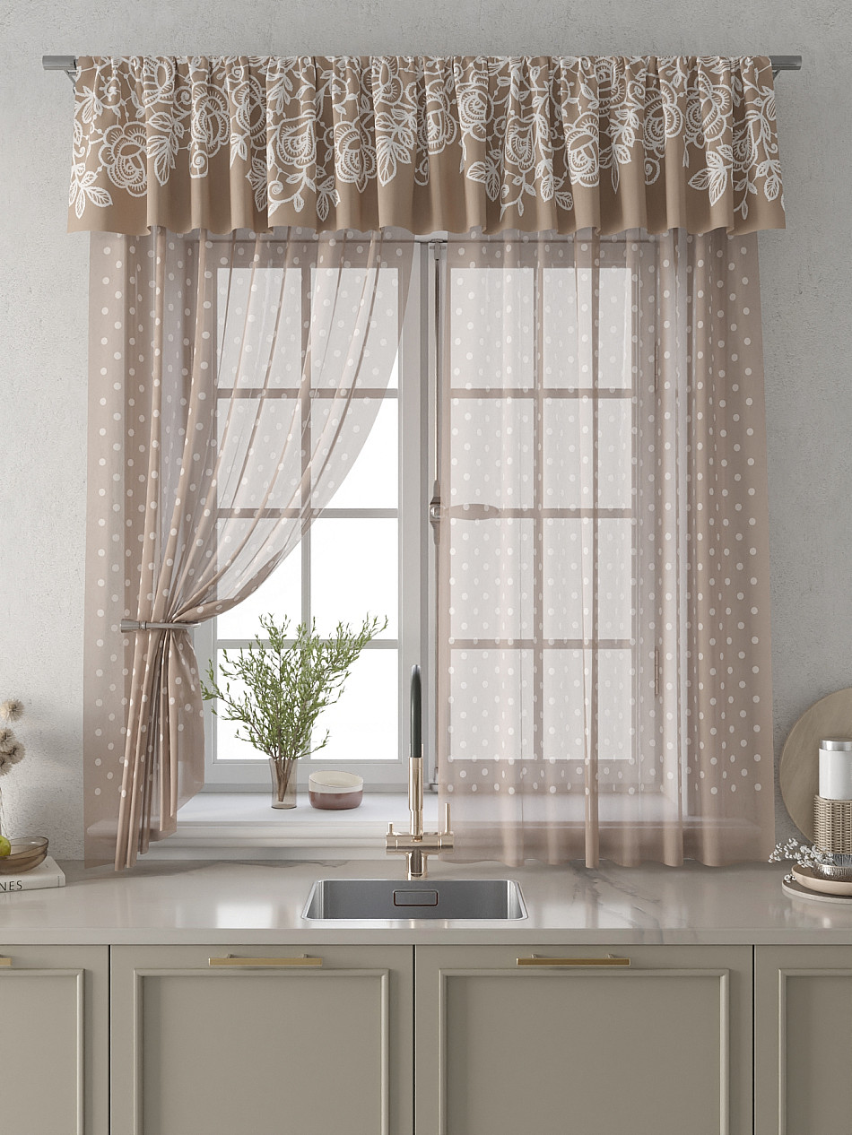 Вуаль 150х180 см. — 2 шт., Ламбрекен 300х40 см. — 1 шт. Комплект штор из вуали оформлены печатным рисунком. Печатный рисунок дает широкие возможности обновить интерьер фактически не требуя ремонта за счет огромного выбора. Ткани с печатным рисунком безопасны и не содержат токсичных веществ. Не смотря на то, что материал легкий, он имеет высокую плотность, мало загрязнятся и не требует особого ухода даже после стирки, что важно для кухонных занавесок. Тюль не выцветает, не растягивается, превосходно драпируются, образуя струящиеся складки. Прекрасное решение для создания красоты и уюта с помощью уникальных дизайнов.