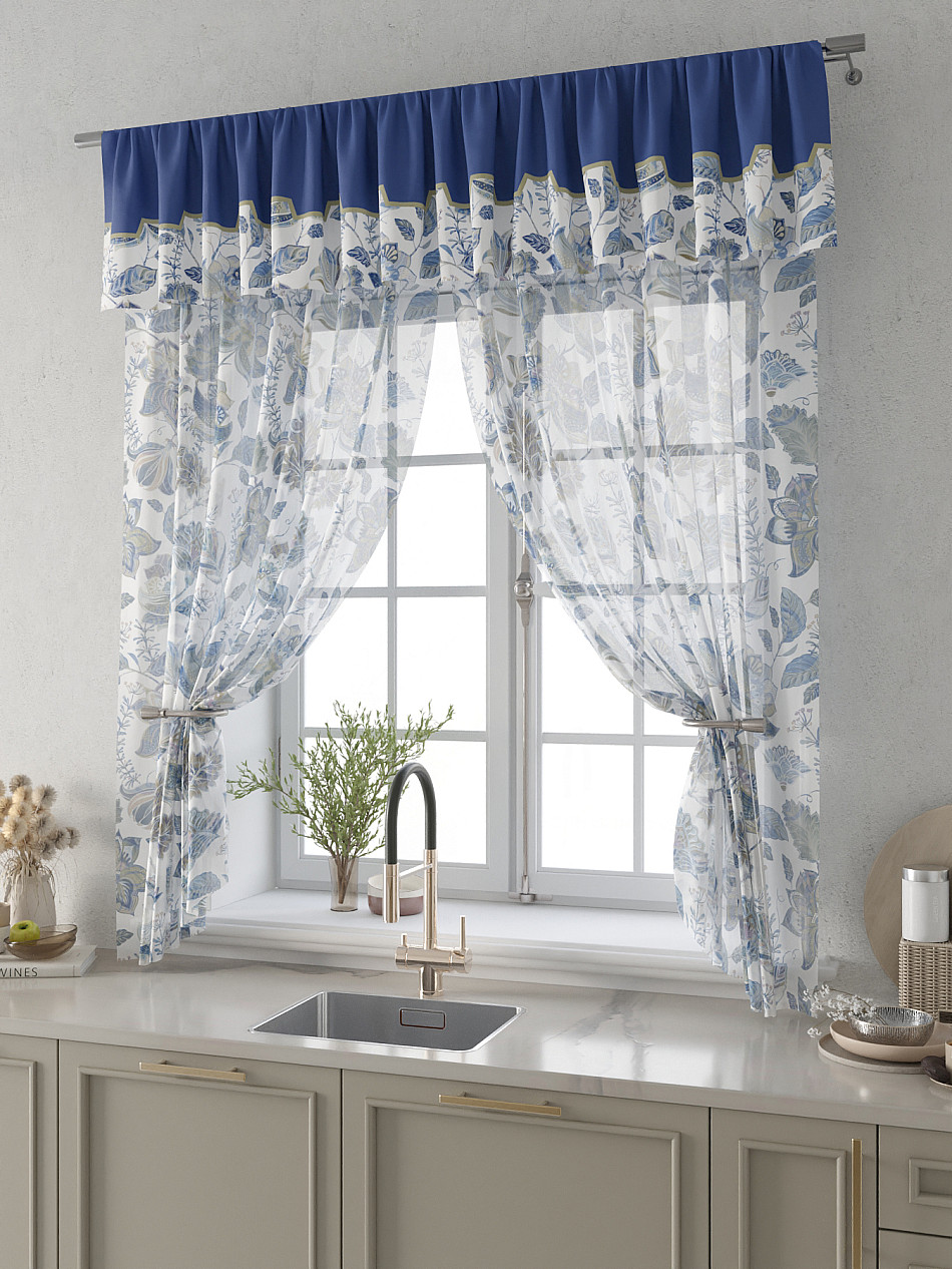 Вуаль 150х160 см. — 2 шт., Ламбрекен 300х40 см. — 1 шт. Комплект штор из вуали оформлены печатным рисунком. Печатный рисунок дает широкие возможности обновить интерьер фактически не требуя ремонта за счет огромного выбора. Ткани с печатным рисунком безопасны и не содержат токсичных веществ. Не смотря на то, что материал легкий, он имеет высокую плотность, мало загрязнятся и не требует особого ухода даже после стирки, что важно для кухонных занавесок. Тюль не выцветает, не растягивается, превосходно драпируются, образуя струящиеся складки. Прекрасное решение для создания красоты и уюта с помощью уникальных дизайнов.
