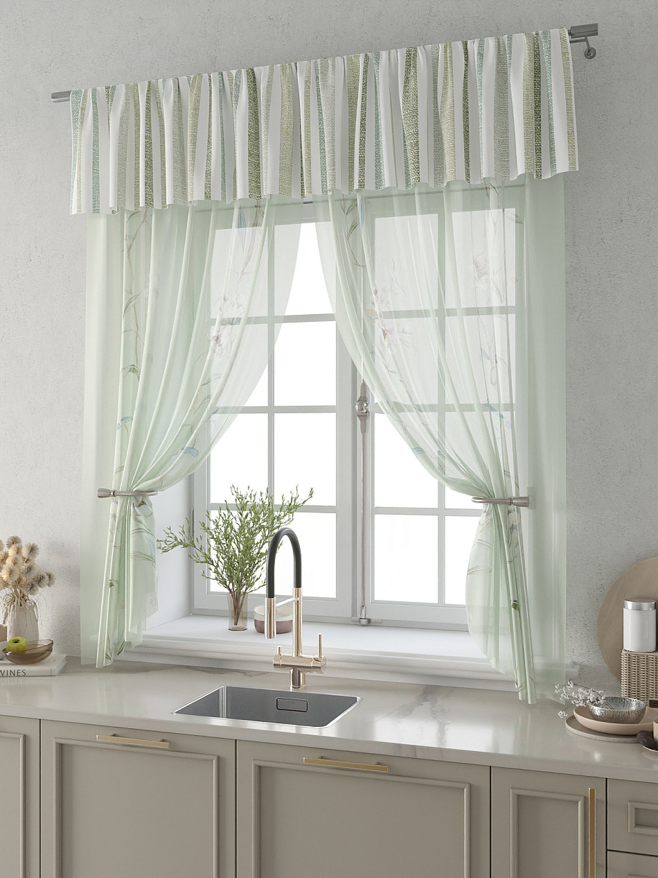 Вуаль 150х180 см. — 2 шт., Ламбрекен 300х40 см. — 1 шт. Комплект штор из вуали оформлены печатным рисунком. Печатный рисунок дает широкие возможности обновить интерьер фактически не требуя ремонта за счет огромного выбора. Ткани с печатным рисунком безопасны и не содержат токсичных веществ. Не смотря на то, что материал легкий, он имеет высокую плотность, мало загрязнятся и не требует особого ухода даже после стирки, что важно для кухонных занавесок. Тюль не выцветает, не растягивается, превосходно драпируются, образуя струящиеся складки. Прекрасное решение для создания красоты и уюта с помощью уникальных дизайнов.