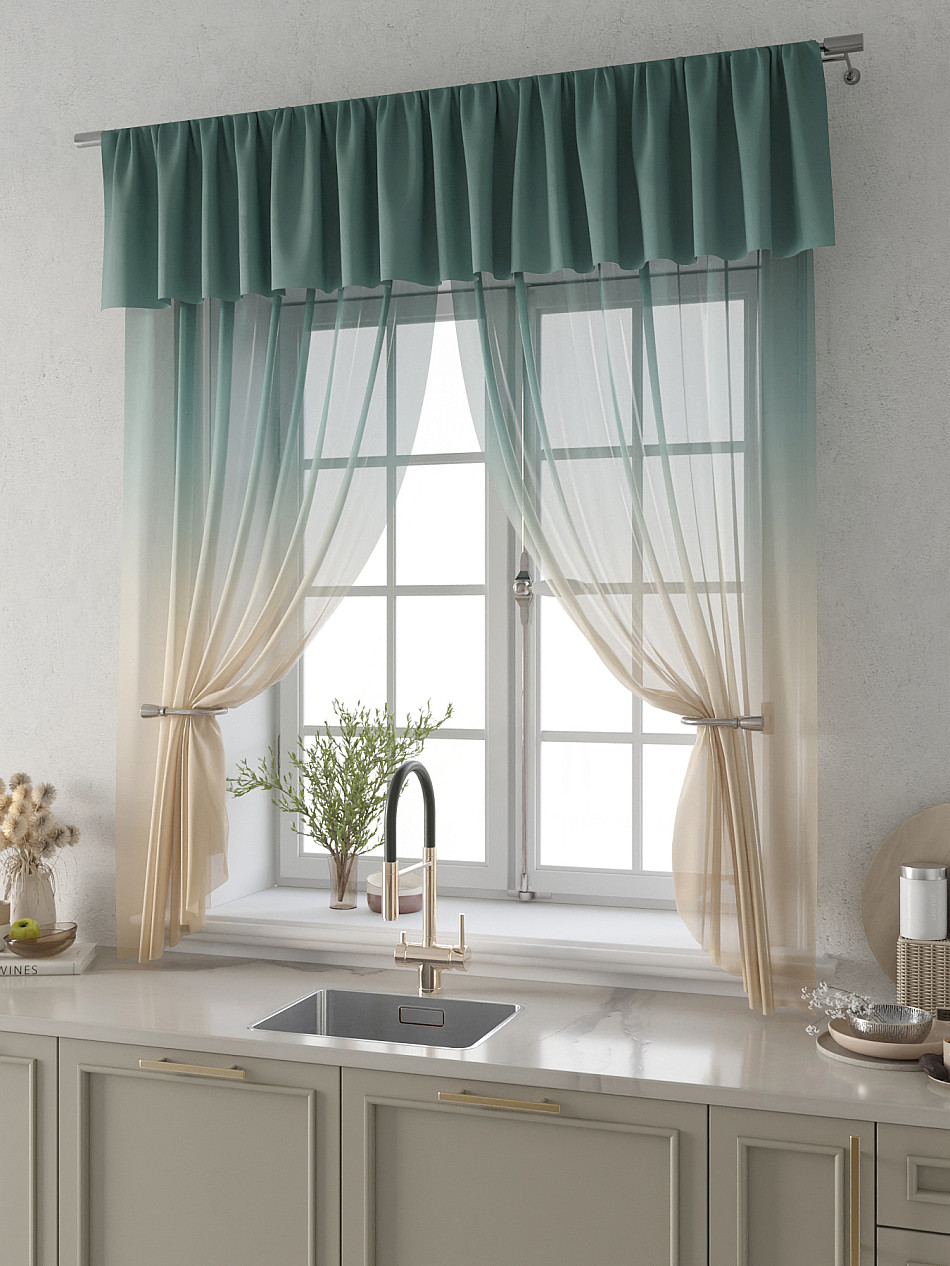 Вуаль 150х160 см. — 2 шт., Ламбрекен 300х40 см. — 1 шт. Комплект штор из вуали оформлены печатным рисунком. Печатный рисунок дает широкие возможности обновить интерьер фактически не требуя ремонта за счет огромного выбора. Ткани с печатным рисунком безопасны и не содержат токсичных веществ. Не смотря на то, что материал легкий, он имеет высокую плотность, мало загрязнятся и не требует особого ухода даже после стирки, что важно для кухонных занавесок. Тюль не выцветает, не растягивается, превосходно драпируются, образуя струящиеся складки. Прекрасное решение для создания красоты и уюта с помощью уникальных дизайнов.