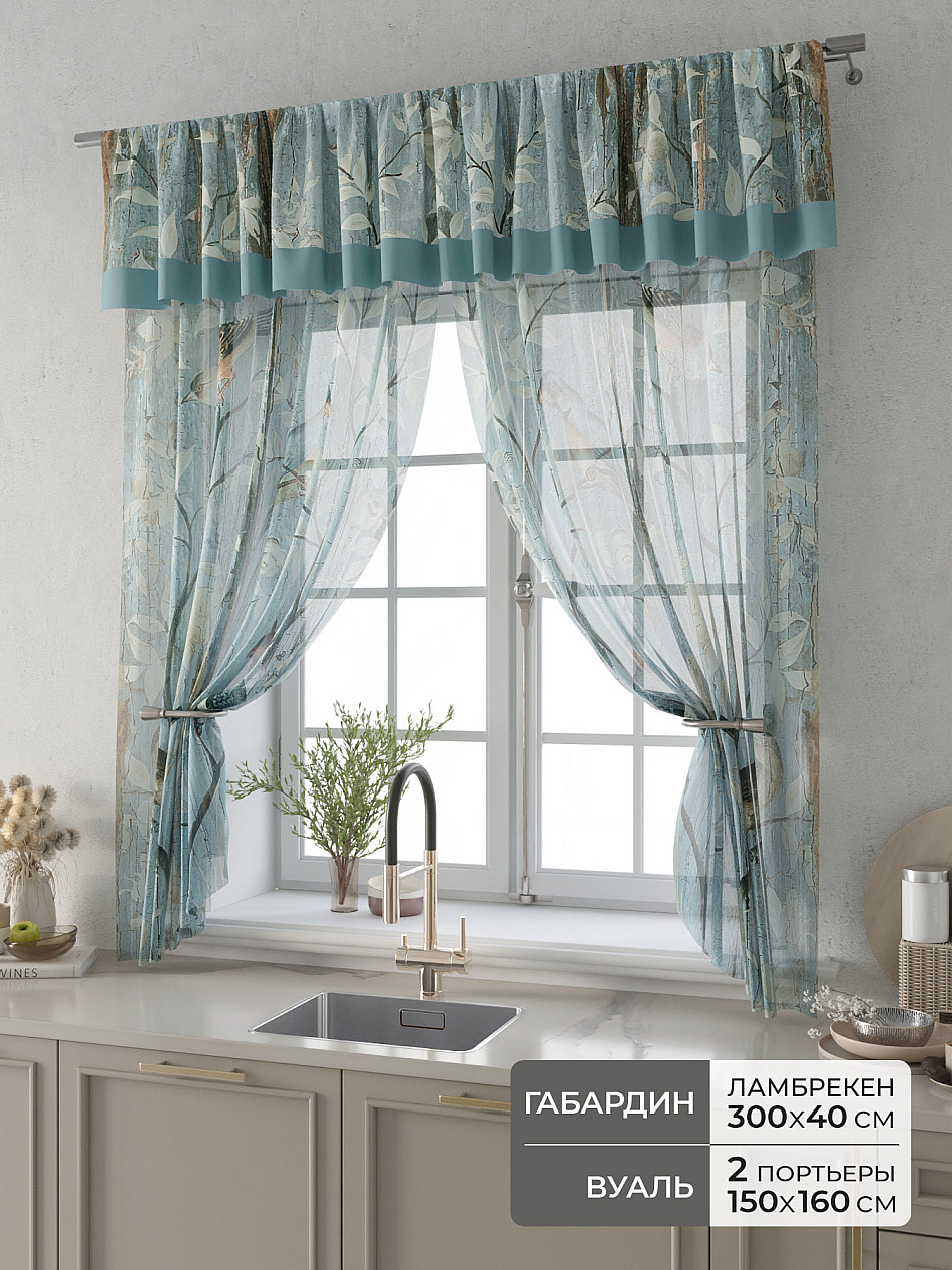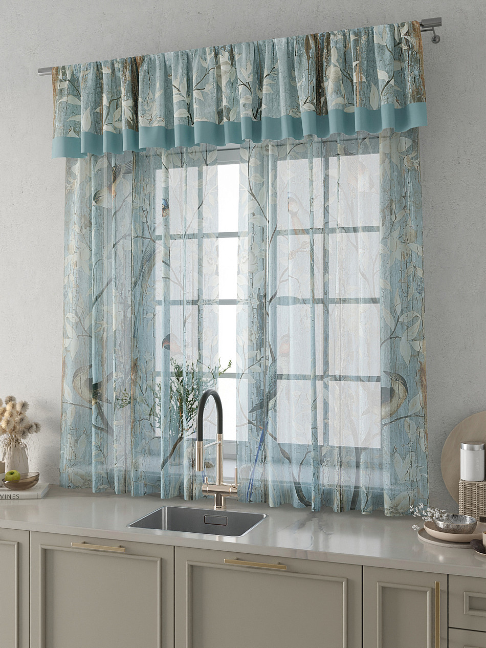 Вуаль 150х160 см. — 2 шт., Ламбрекен 300х40 см. — 1 шт. Комплект штор из вуали оформлены печатным рисунком. Печатный рисунок дает широкие возможности обновить интерьер фактически не требуя ремонта за счет огромного выбора. Ткани с печатным рисунком безопасны и не содержат токсичных веществ. Не смотря на то, что материал легкий, он имеет высокую плотность, мало загрязнятся и не требует особого ухода даже после стирки, что важно для кухонных занавесок. Тюль не выцветает, не растягивается, превосходно драпируются, образуя струящиеся складки. Прекрасное решение для создания красоты и уюта с помощью уникальных дизайнов.
