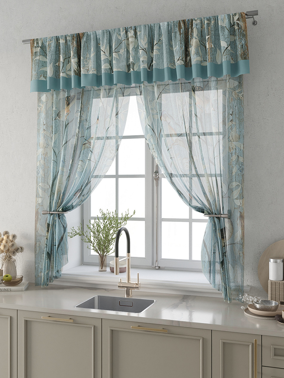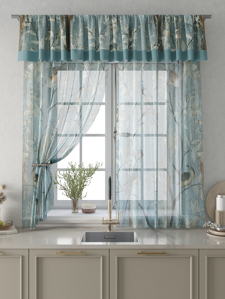 Вуаль 150х180 см. — 2 шт., Ламбрекен 300х40 см. — 1 шт. Комплект штор из вуали оформлены печатным рисунком. Печатный рисунок дает широкие возможности обновить интерьер фактически не требуя ремонта за счет огромного выбора. Ткани с печатным рисунком безопасны и не содержат токсичных веществ. Не смотря на то, что материал легкий, он имеет высокую плотность, мало загрязнятся и не требует особого ухода даже после стирки, что важно для кухонных занавесок. Тюль не выцветает, не растягивается, превосходно драпируются, образуя струящиеся складки. Прекрасное решение для создания красоты и уюта с помощью уникальных дизайнов.