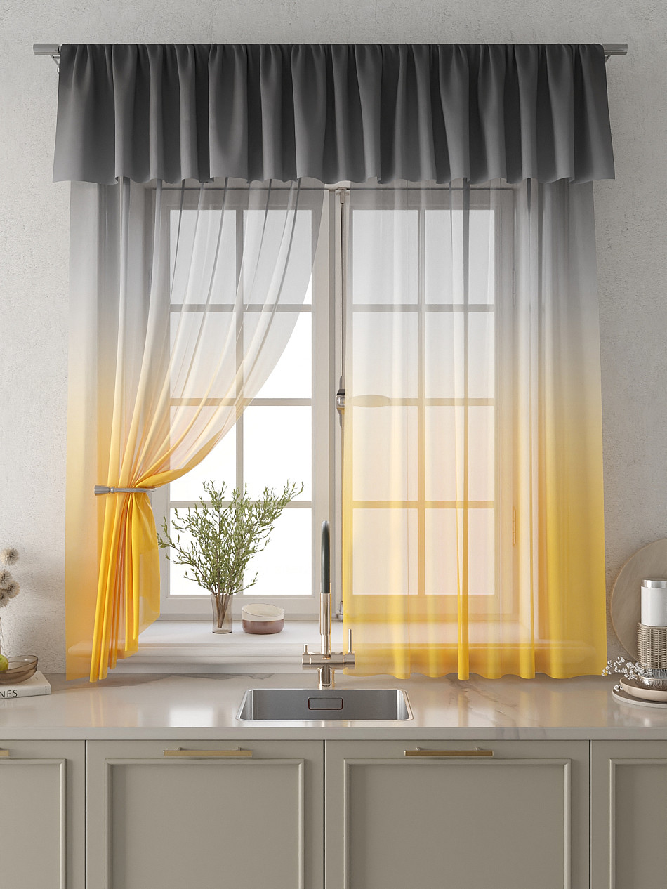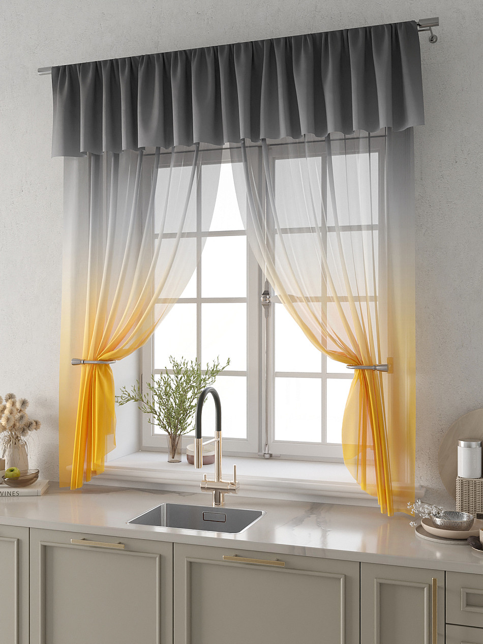 Вуаль 150х180 см. — 2 шт., Ламбрекен 300х40 см. — 1 шт. Комплект штор из вуали оформлены печатным рисунком. Печатный рисунок дает широкие возможности обновить интерьер фактически не требуя ремонта за счет огромного выбора. Ткани с печатным рисунком безопасны и не содержат токсичных веществ. Не смотря на то, что материал легкий, он имеет высокую плотность, мало загрязнятся и не требует особого ухода даже после стирки, что важно для кухонных занавесок. Тюль не выцветает, не растягивается, превосходно драпируются, образуя струящиеся складки. Прекрасное решение для создания красоты и уюта с помощью уникальных дизайнов.