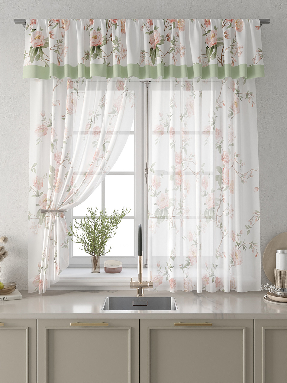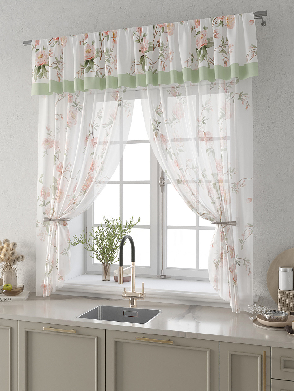 Вуаль 150х180 см. — 2 шт., Ламбрекен 300х40 см. — 1 шт. Комплект штор из вуали оформлены печатным рисунком. Печатный рисунок дает широкие возможности обновить интерьер фактически не требуя ремонта за счет огромного выбора. Ткани с печатным рисунком безопасны и не содержат токсичных веществ. Не смотря на то, что материал легкий, он имеет высокую плотность, мало загрязнятся и не требует особого ухода даже после стирки, что важно для кухонных занавесок. Тюль не выцветает, не растягивается, превосходно драпируются, образуя струящиеся складки. Прекрасное решение для создания красоты и уюта с помощью уникальных дизайнов.