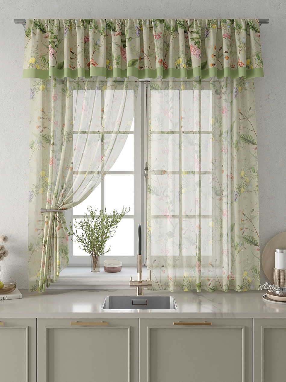 Вуаль 150х180 см. — 2 шт., Ламбрекен 300х40 см. — 1 шт. Комплект штор из вуали оформлены печатным рисунком. Печатный рисунок дает широкие возможности обновить интерьер фактически не требуя ремонта за счет огромного выбора. Ткани с печатным рисунком безопасны и не содержат токсичных веществ. Не смотря на то, что материал легкий, он имеет высокую плотность, мало загрязнятся и не требует особого ухода даже после стирки, что важно для кухонных занавесок. Тюль не выцветает, не растягивается, превосходно драпируются, образуя струящиеся складки. Прекрасное решение для создания красоты и уюта с помощью уникальных дизайнов.