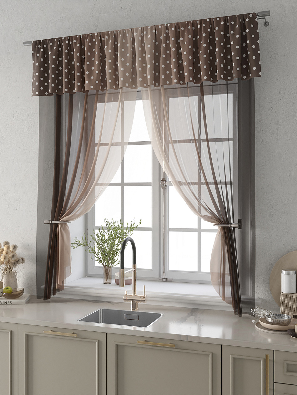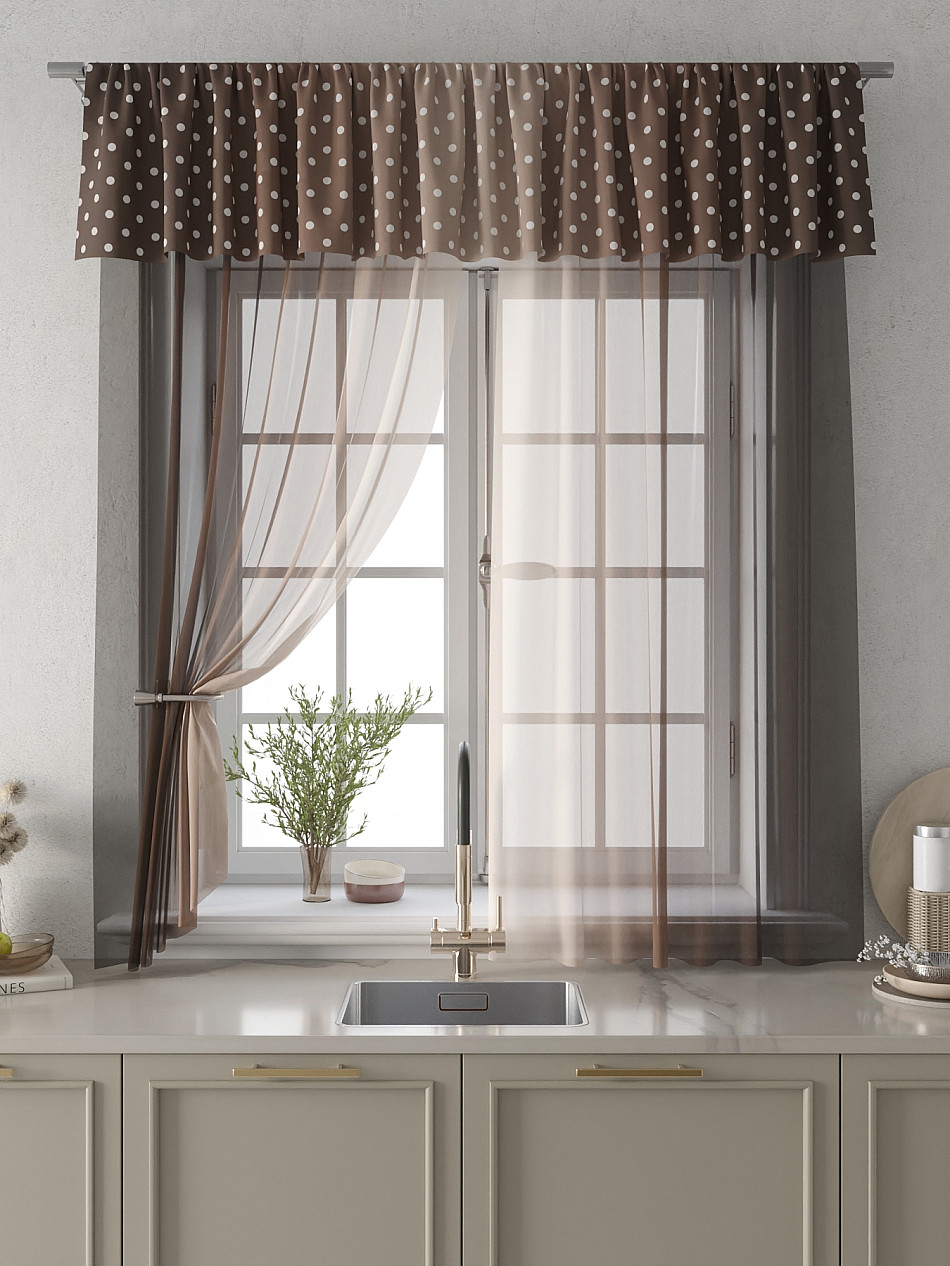 Вуаль 150х180 см. — 2 шт., Ламбрекен 300х40 см. — 1 шт. Комплект штор из вуали оформлены печатным рисунком. Печатный рисунок дает широкие возможности обновить интерьер фактически не требуя ремонта за счет огромного выбора. Ткани с печатным рисунком безопасны и не содержат токсичных веществ. Не смотря на то, что материал легкий, он имеет высокую плотность, мало загрязнятся и не требует особого ухода даже после стирки, что важно для кухонных занавесок. Тюль не выцветает, не растягивается, превосходно драпируются, образуя струящиеся складки. Прекрасное решение для создания красоты и уюта с помощью уникальных дизайнов.