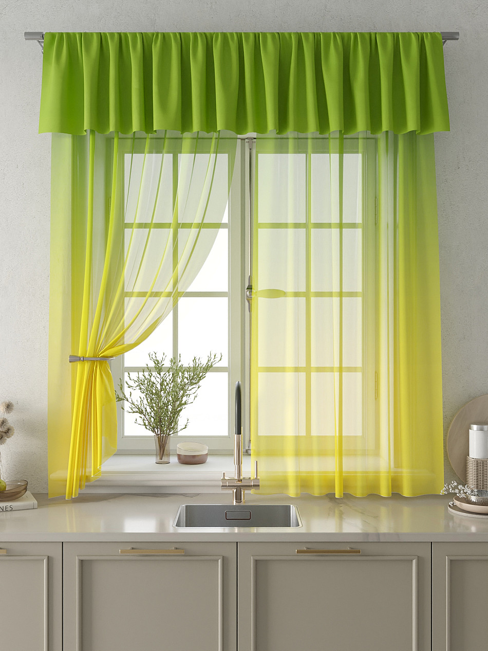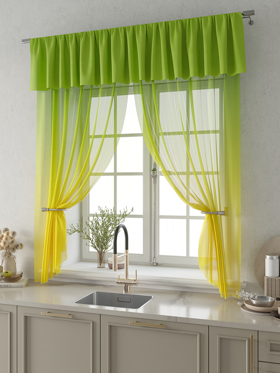 Вуаль 150х180 см. — 2 шт., Ламбрекен 300х40 см. — 1 шт. Комплект штор из вуали оформлены печатным рисунком. Печатный рисунок дает широкие возможности обновить интерьер фактически не требуя ремонта за счет огромного выбора. Ткани с печатным рисунком безопасны и не содержат токсичных веществ. Не смотря на то, что материал легкий, он имеет высокую плотность, мало загрязнятся и не требует особого ухода даже после стирки, что важно для кухонных занавесок. Тюль не выцветает, не растягивается, превосходно драпируются, образуя струящиеся складки. Прекрасное решение для создания красоты и уюта с помощью уникальных дизайнов.