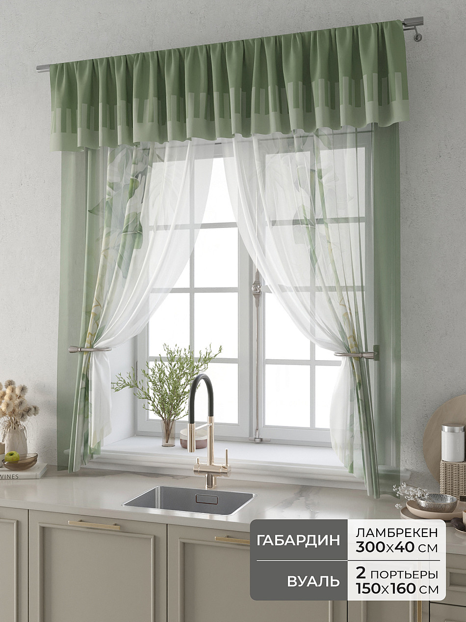 Вуаль 150х160 см — 2 шт., Ламбрекен 300х40 см — 1 шт. ( Изменить высоту) Крепление: шторная лента (крючки), кулиска Подробнее