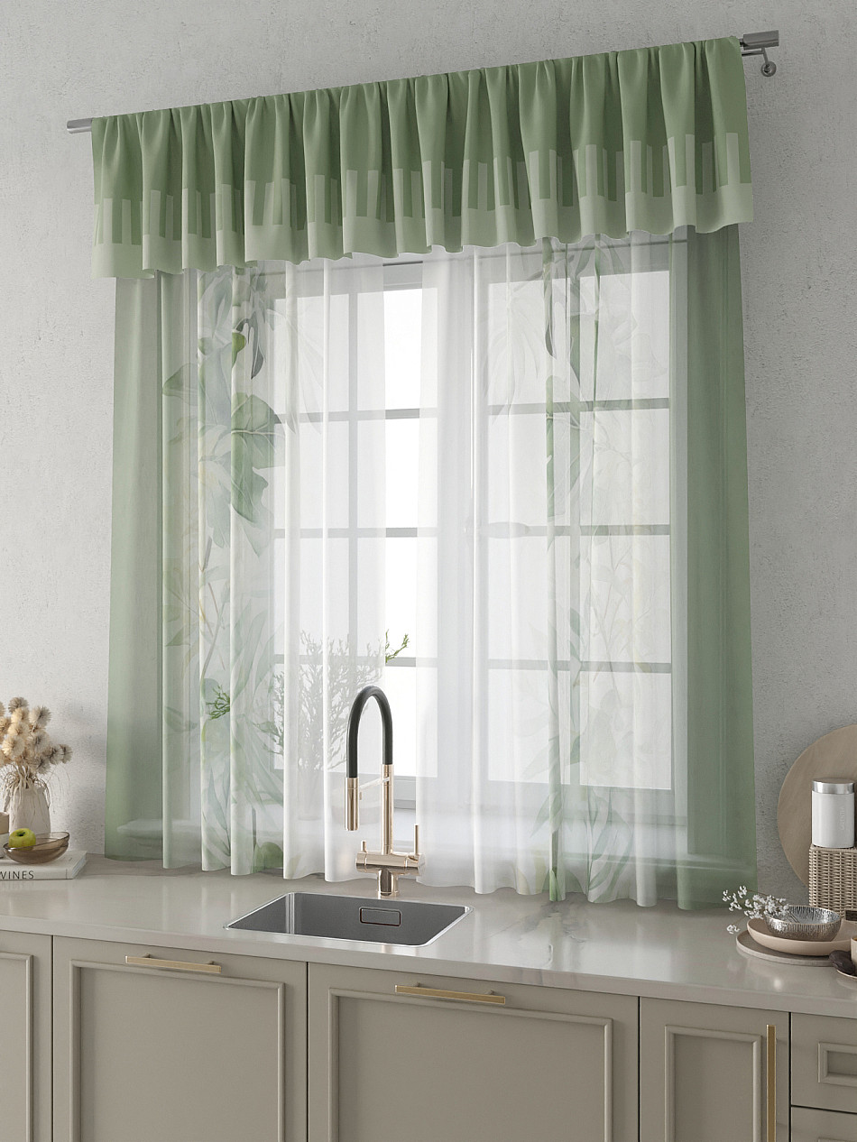 Вуаль 150х160 см. — 2 шт., Ламбрекен 300х40 см. — 1 шт. Комплект штор из вуали оформлены печатным рисунком. Печатный рисунок дает широкие возможности обновить интерьер фактически не требуя ремонта за счет огромного выбора. Ткани с печатным рисунком безопасны и не содержат токсичных веществ. Не смотря на то, что материал легкий, он имеет высокую плотность, мало загрязнятся и не требует особого ухода даже после стирки, что важно для кухонных занавесок. Тюль не выцветает, не растягивается, превосходно драпируются, образуя струящиеся складки. Прекрасное решение для создания красоты и уюта с помощью уникальных дизайнов.
