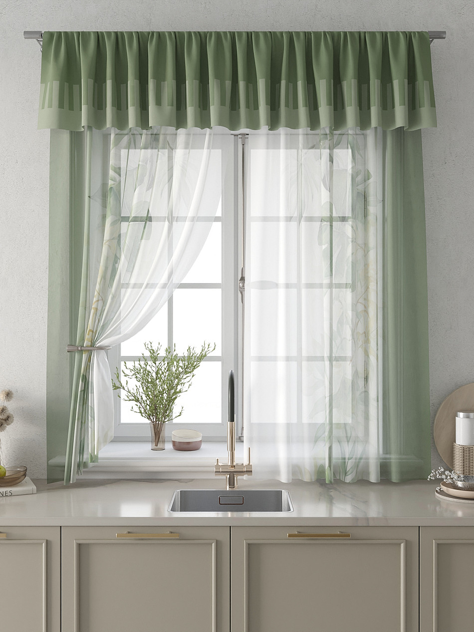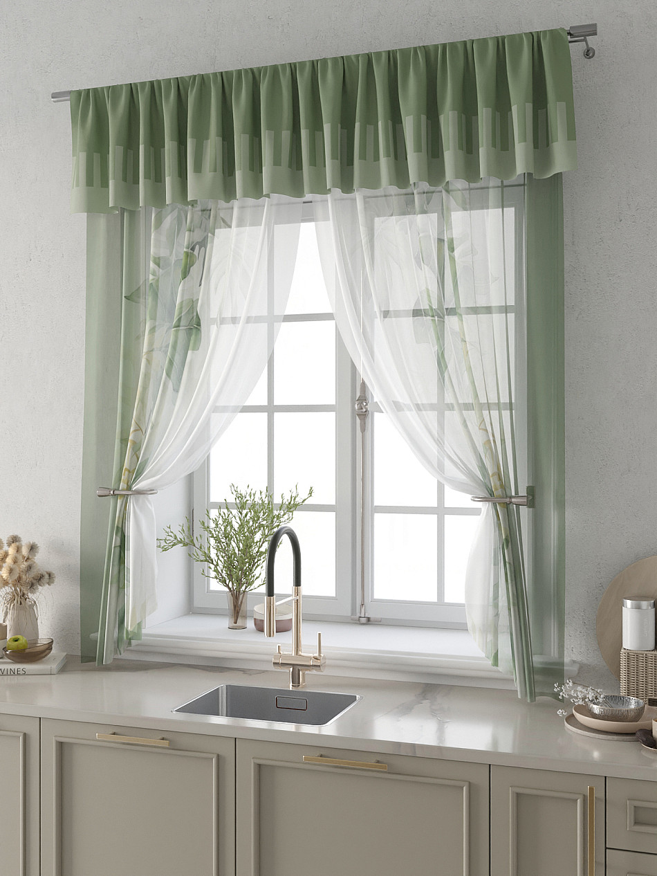 Вуаль 150х180 см. — 2 шт., Ламбрекен 300х40 см. — 1 шт. Комплект штор из вуали оформлены печатным рисунком. Печатный рисунок дает широкие возможности обновить интерьер фактически не требуя ремонта за счет огромного выбора. Ткани с печатным рисунком безопасны и не содержат токсичных веществ. Не смотря на то, что материал легкий, он имеет высокую плотность, мало загрязнятся и не требует особого ухода даже после стирки, что важно для кухонных занавесок. Тюль не выцветает, не растягивается, превосходно драпируются, образуя струящиеся складки. Прекрасное решение для создания красоты и уюта с помощью уникальных дизайнов.