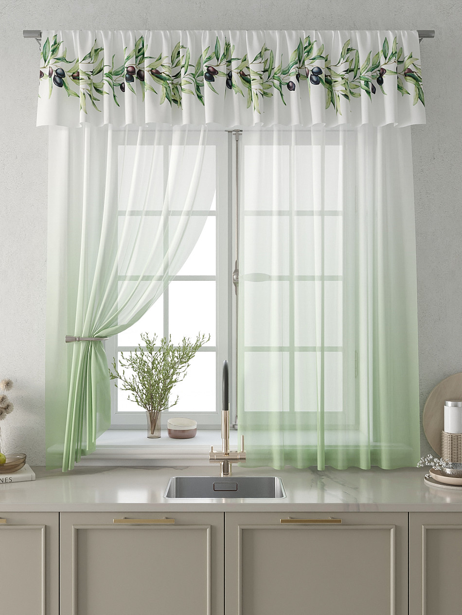 Вуаль 150х160 см. — 2 шт., Ламбрекен 300х40 см. — 1 шт. Комплект штор из вуали оформлены печатным рисунком. Печатный рисунок дает широкие возможности обновить интерьер фактически не требуя ремонта за счет огромного выбора. Ткани с печатным рисунком безопасны и не содержат токсичных веществ. Не смотря на то, что материал легкий, он имеет высокую плотность, мало загрязнятся и не требует особого ухода даже после стирки, что важно для кухонных занавесок. Тюль не выцветает, не растягивается, превосходно драпируются, образуя струящиеся складки. Прекрасное решение для создания красоты и уюта с помощью уникальных дизайнов.