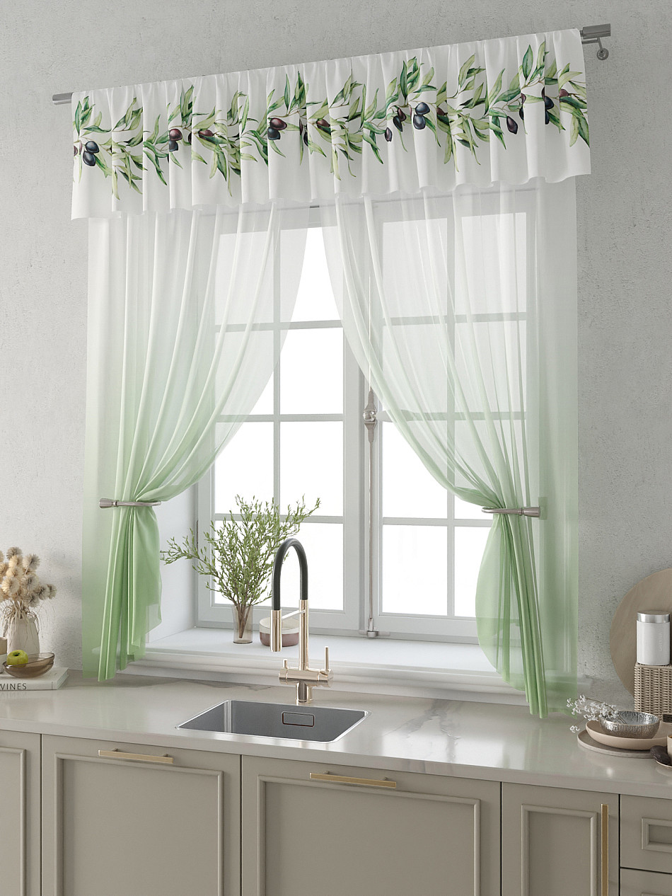 Вуаль 150х180 см. — 2 шт., Ламбрекен 300х40 см. — 1 шт. Комплект штор из вуали оформлены печатным рисунком. Печатный рисунок дает широкие возможности обновить интерьер фактически не требуя ремонта за счет огромного выбора. Ткани с печатным рисунком безопасны и не содержат токсичных веществ. Не смотря на то, что материал легкий, он имеет высокую плотность, мало загрязнятся и не требует особого ухода даже после стирки, что важно для кухонных занавесок. Тюль не выцветает, не растягивается, превосходно драпируются, образуя струящиеся складки. Прекрасное решение для создания красоты и уюта с помощью уникальных дизайнов.