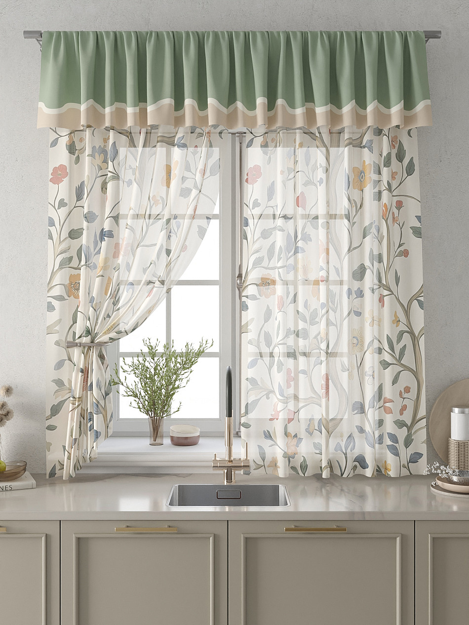 Вуаль 150х160 см. — 2 шт., Ламбрекен 300х40 см. — 1 шт. Комплект штор из вуали оформлены печатным рисунком. Печатный рисунок дает широкие возможности обновить интерьер фактически не требуя ремонта за счет огромного выбора. Ткани с печатным рисунком безопасны и не содержат токсичных веществ. Не смотря на то, что материал легкий, он имеет высокую плотность, мало загрязнятся и не требует особого ухода даже после стирки, что важно для кухонных занавесок. Тюль не выцветает, не растягивается, превосходно драпируются, образуя струящиеся складки. Прекрасное решение для создания красоты и уюта с помощью уникальных дизайнов.