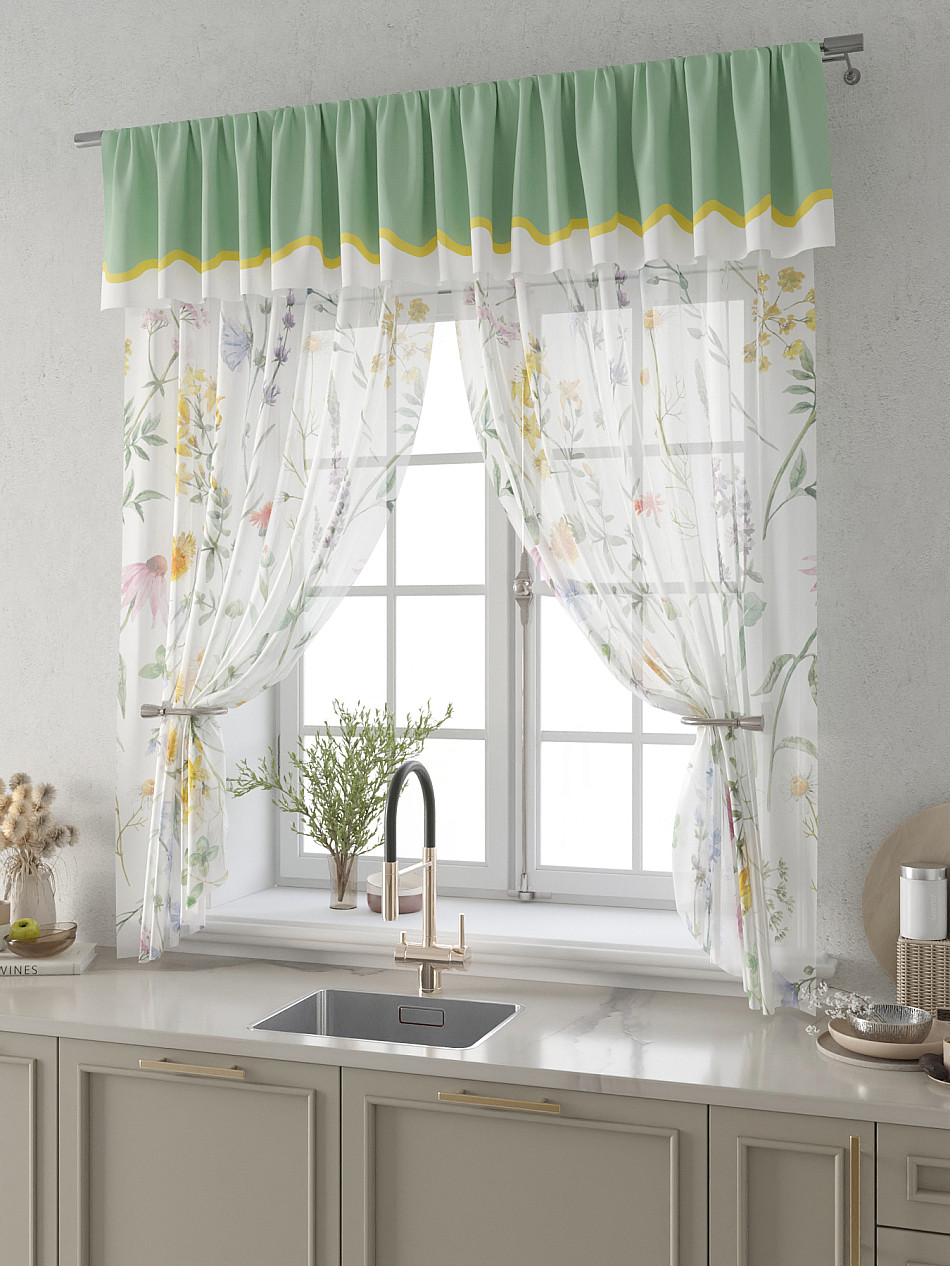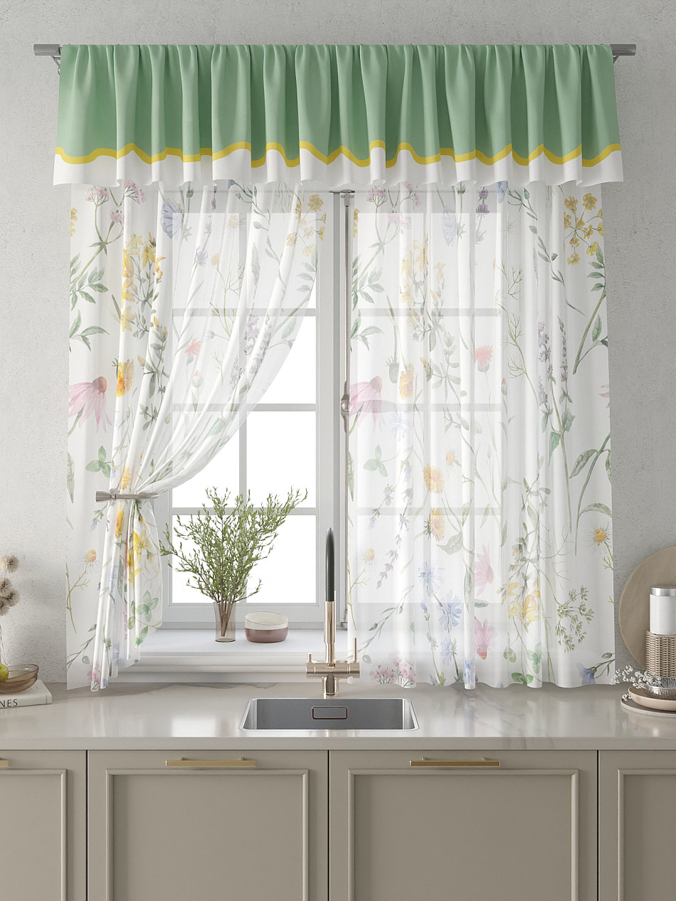 Вуаль 150х160 см. — 2 шт., Ламбрекен 300х40 см. — 1 шт. Комплект штор из вуали оформлены печатным рисунком. Печатный рисунок дает широкие возможности обновить интерьер фактически не требуя ремонта за счет огромного выбора. Ткани с печатным рисунком безопасны и не содержат токсичных веществ. Не смотря на то, что материал легкий, он имеет высокую плотность, мало загрязнятся и не требует особого ухода даже после стирки, что важно для кухонных занавесок. Тюль не выцветает, не растягивается, превосходно драпируются, образуя струящиеся складки. Прекрасное решение для создания красоты и уюта с помощью уникальных дизайнов.